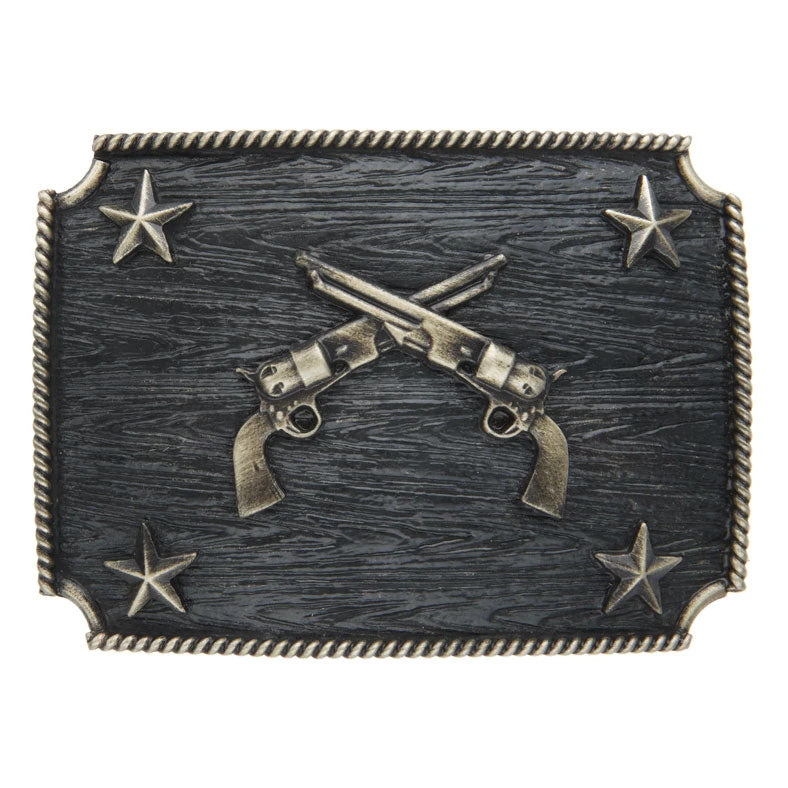 From AndWest, this rectangle buckle features crossed pistols in the middle with 4 stars, one in each corner. Itβs set on a vintage wood-like background and has a rope border. The Iconic buckle collection features timeless themes of the West.