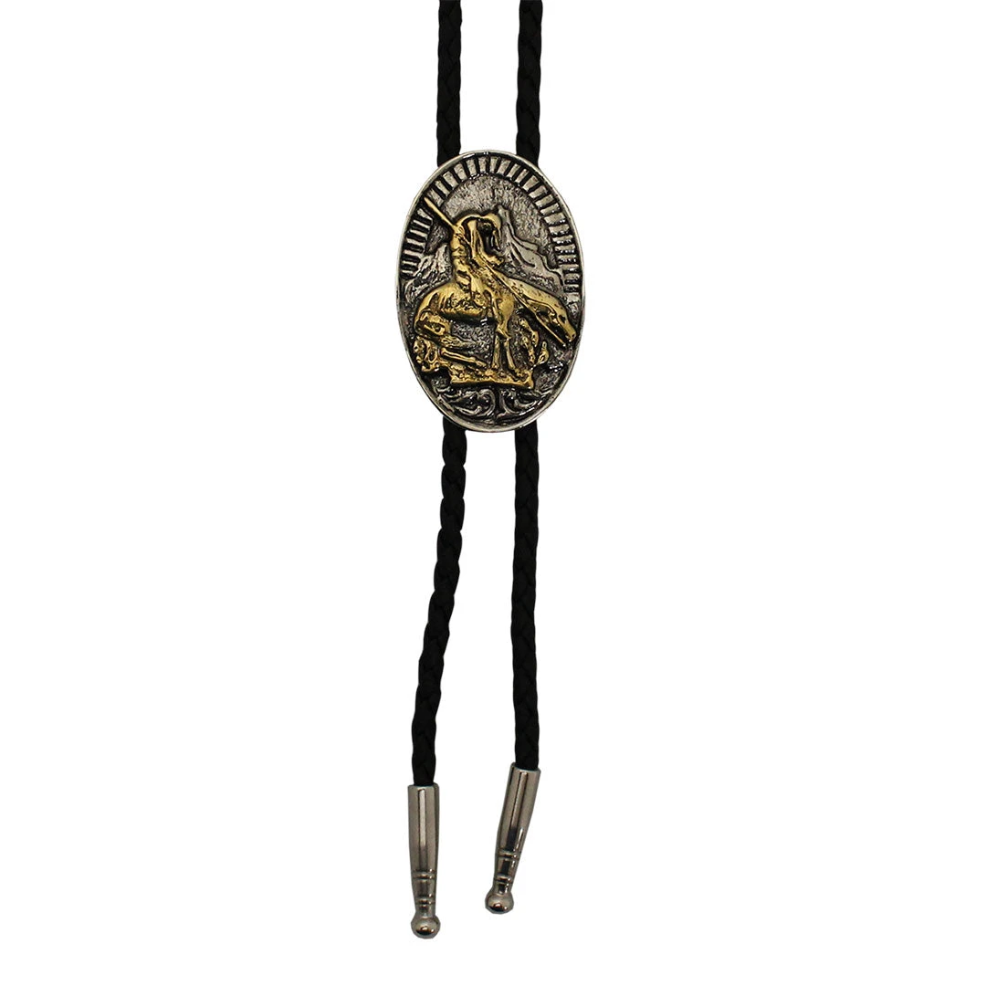 When it’s time to dress up, you can’t go wrong with a classic western look. This stylish bolo tie is made of braided leather with metal tips and has a decorative oval Concho slide with gold tone figure.
