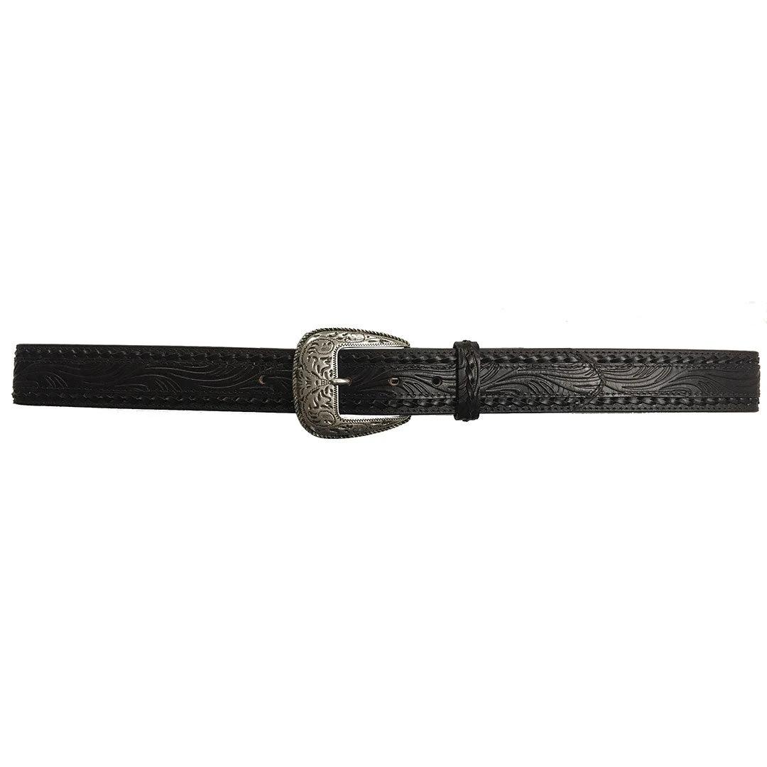 This tooled belt from AndWest features a twisted lace design around the edge and keeper and antique silver buckle.