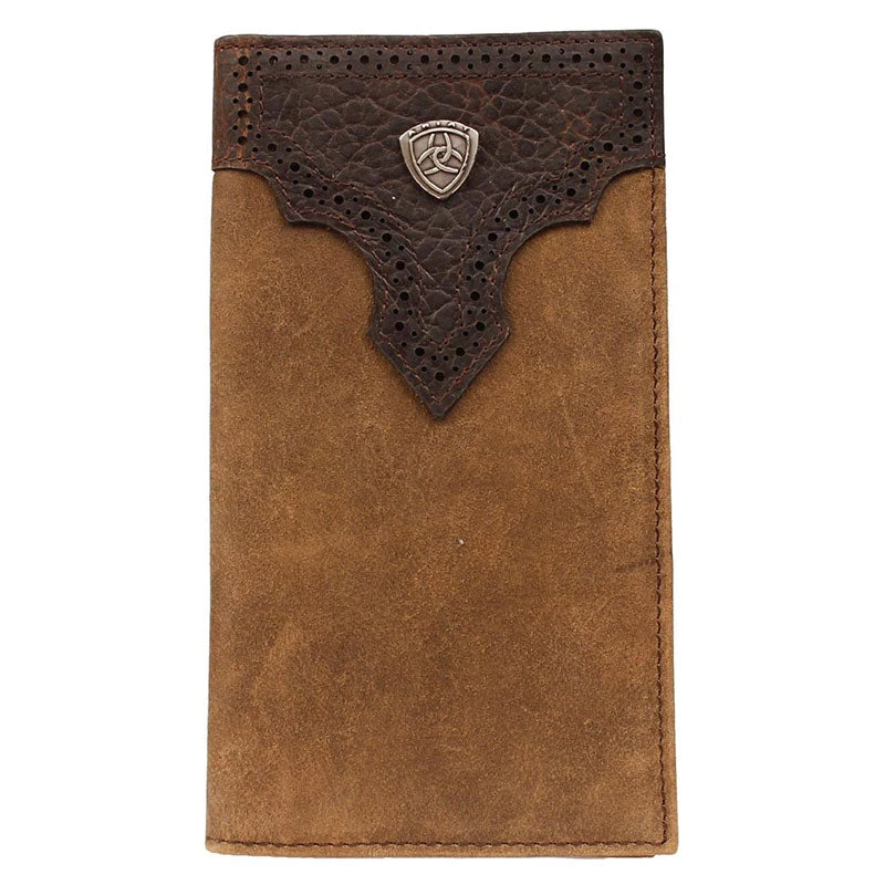 This Ariat distressed brown top grain leather rodeo wallet features a dark brown perforated overlay with a silver Ariat shield Concho on the front.