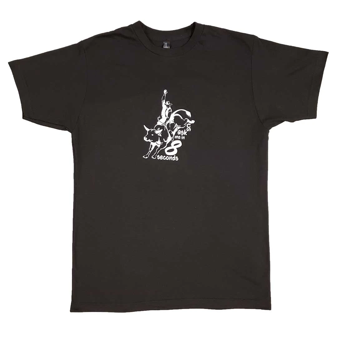 Custom made for the Calgary Stampede, this black t-shirt features an “ask me in 8 seconds” bull rider graphic.