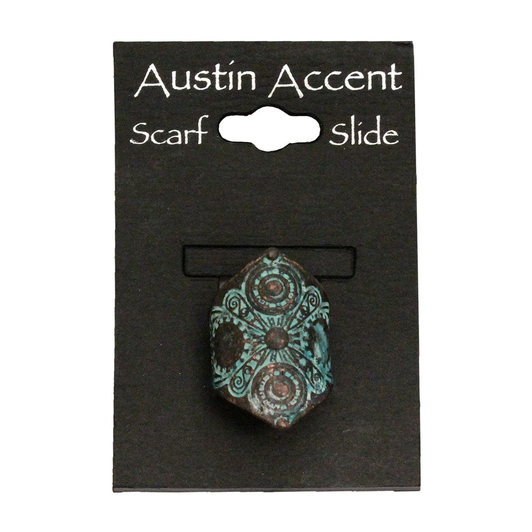 Add a finishing touch to any scarf with this diamond shaped copper patina or silver scarf slide featuring a scroll pattern from Austin Accent.