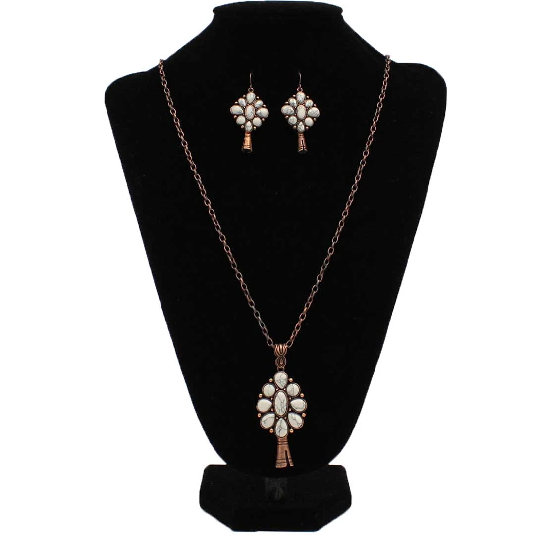 This beautiful Blazin Roxx set is by M&F Western Products. The necklace and earrings have marbled ivory stones in a flower shape placed in a copper setting. French hooks.