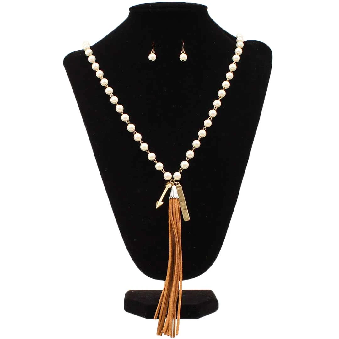 Instantly update your wardrobe with this Blazin Roxx necklace set by M&F Western Products. The necklace has a classic look with the pearl strand, a brown fringe tassel and arrow charms dangle from the pearl strand. Matching French hook style pearl earrings complete this great set. You wont want to leave the house without them.