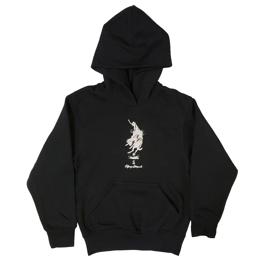 This hoodie features Calgary Stampede logo, bronc screenprint, kangaroo front pocket and ribbed sleeve cuff and hem.