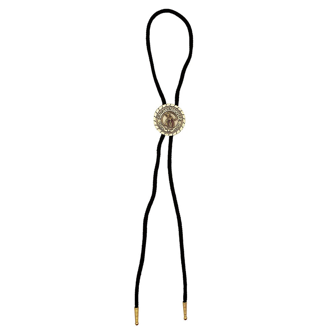 This retro bolo tie features Calgary Stampede Rodeo Slim in antique gold, black cord and finished with gold tips.