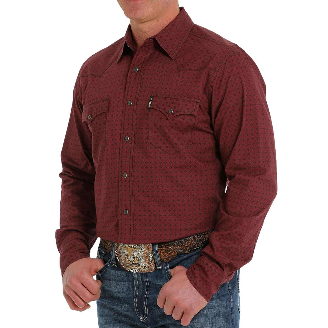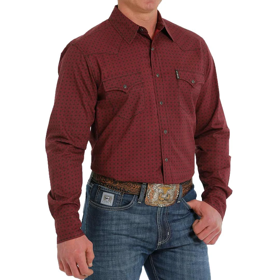 Built to last with timeless style, this burgundy printed cotton plain weave adds the Western flair you need for blue jeans and cowboy boots. Design details include Modern Fit construction with double front pockets, embroidered CINCH logo, a spread collar and black-gray marble snaps.