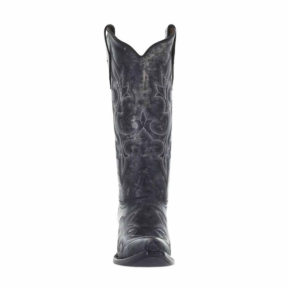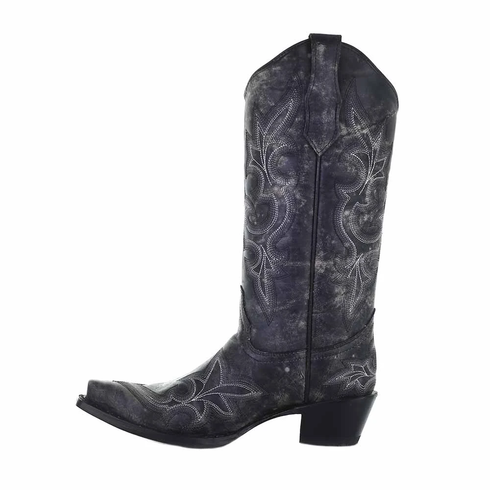 This black distressed leather cowgirl boot from Circle G features contrast embroidery, with a snip toe, 2″ cowboy heel and goodyear welt construction that will have you feeling as good as you look all night long.