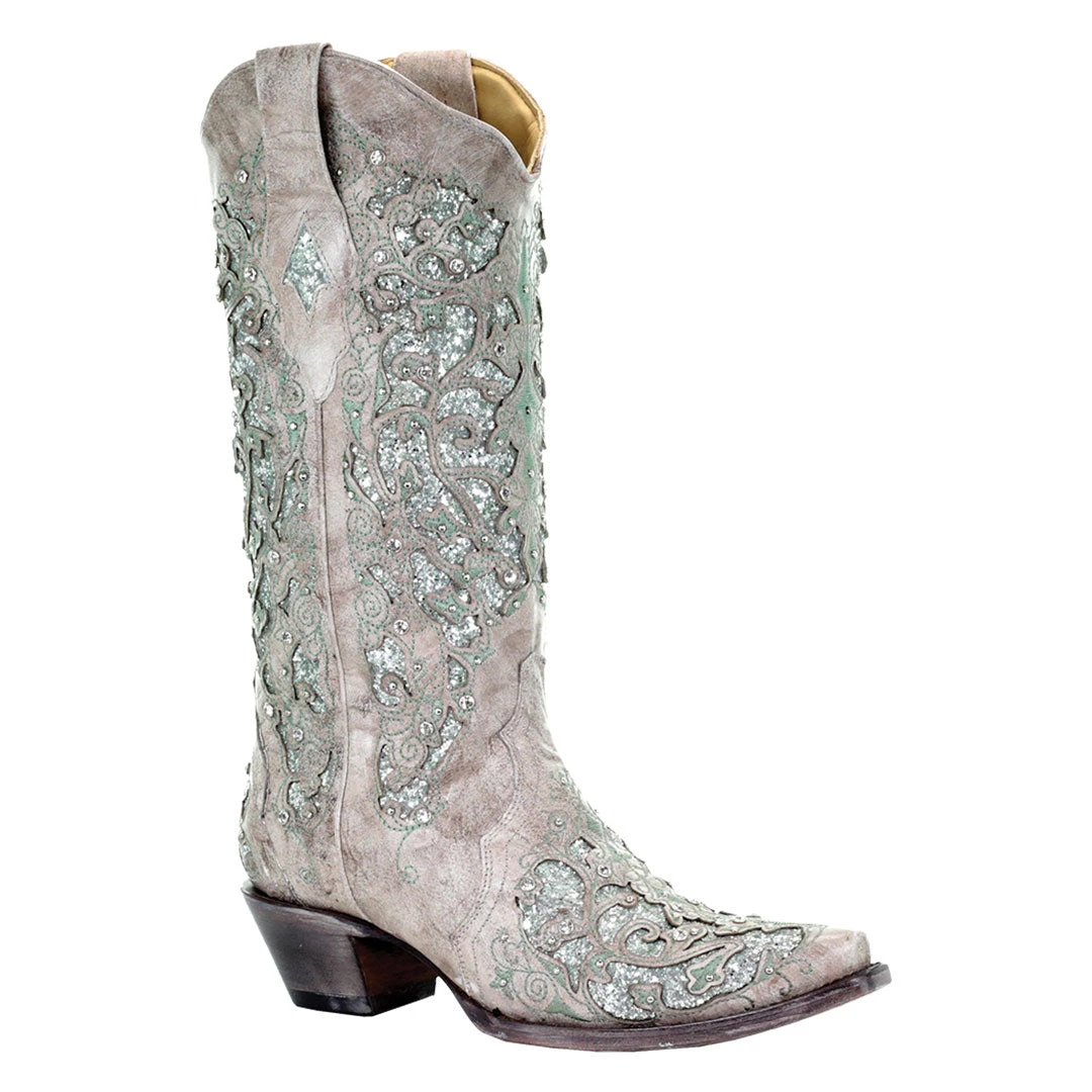 From Corral Boots’ wedding special line, the Martina Green is an alluring pair of boots perfect for parties, weddings or any occasion where you want to standout. Embellished with glitter inlay and crystals, and a classic cowboy heel, this boot is sure to make a statement.