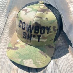 - The perfect choice for your hunting trip, or every day. This cap from Cowboy SH*t features camo front panels, black mesh back, black logo embroidery and a one size fits most snap back closure.