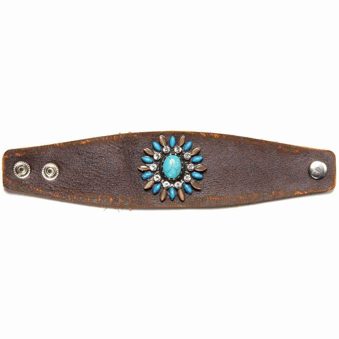 This Cowgirl Confetti hand distressed embossed dark brown leather cuff features peach mother of pearl and blue cat’s eye stone flower and adjustable snap closure.