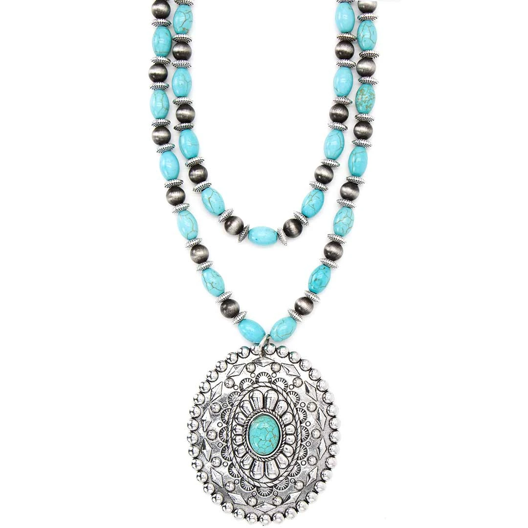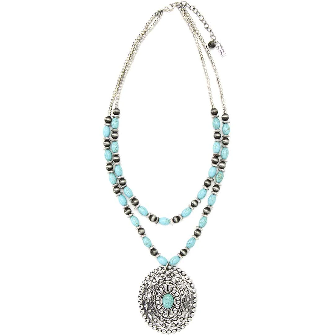 This Cowgirl Confetti antiqued silver concho necklace is double layered with delicate etched silver beads, Navajo pearls, and turquoise.
