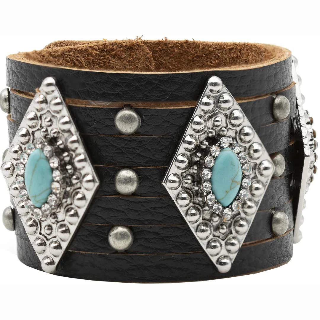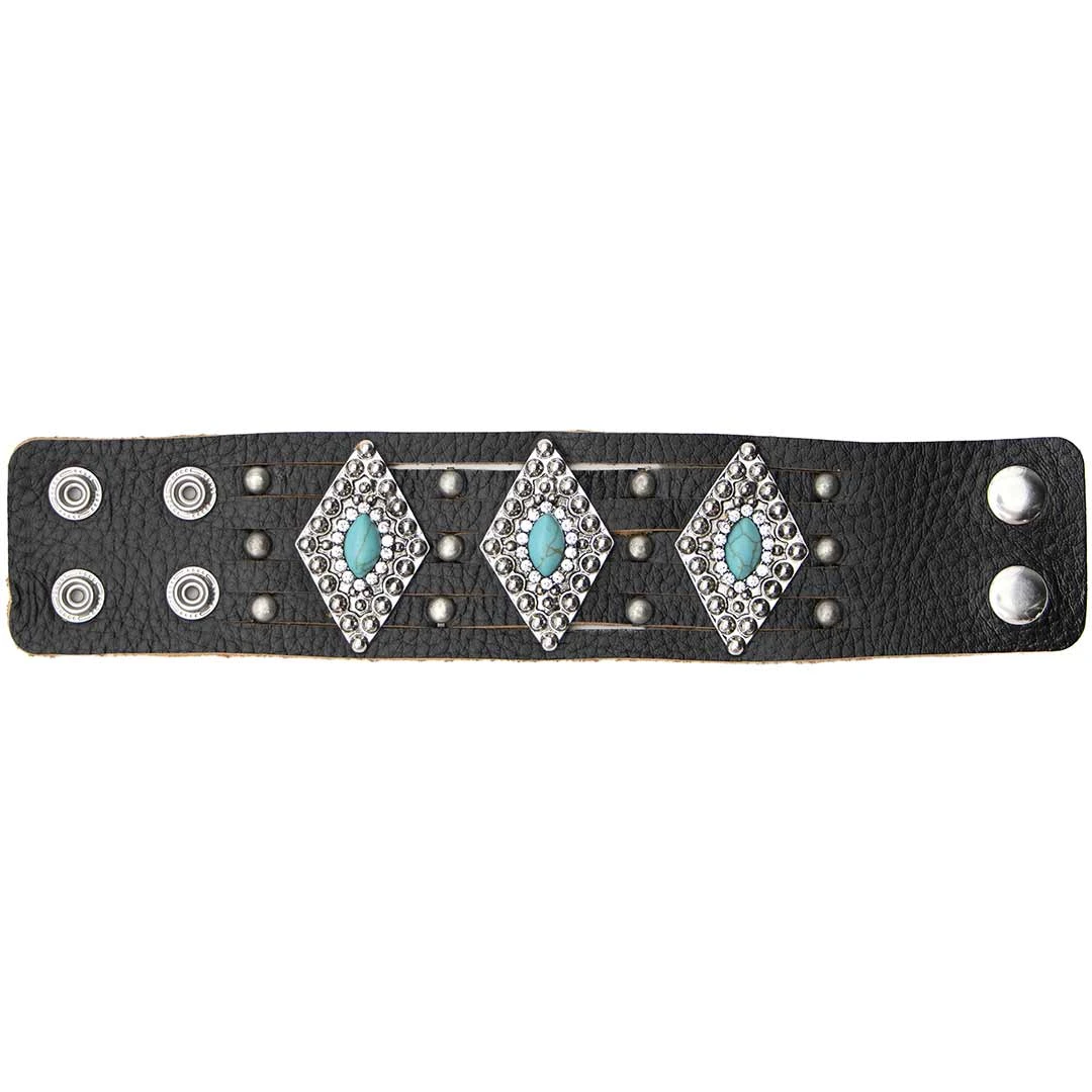 This Cowgirl Confetti black leather multi-strap studded cuff features three diamond shaped medallions with rhinestones and turquoise navettes and an adjustable snap closure.