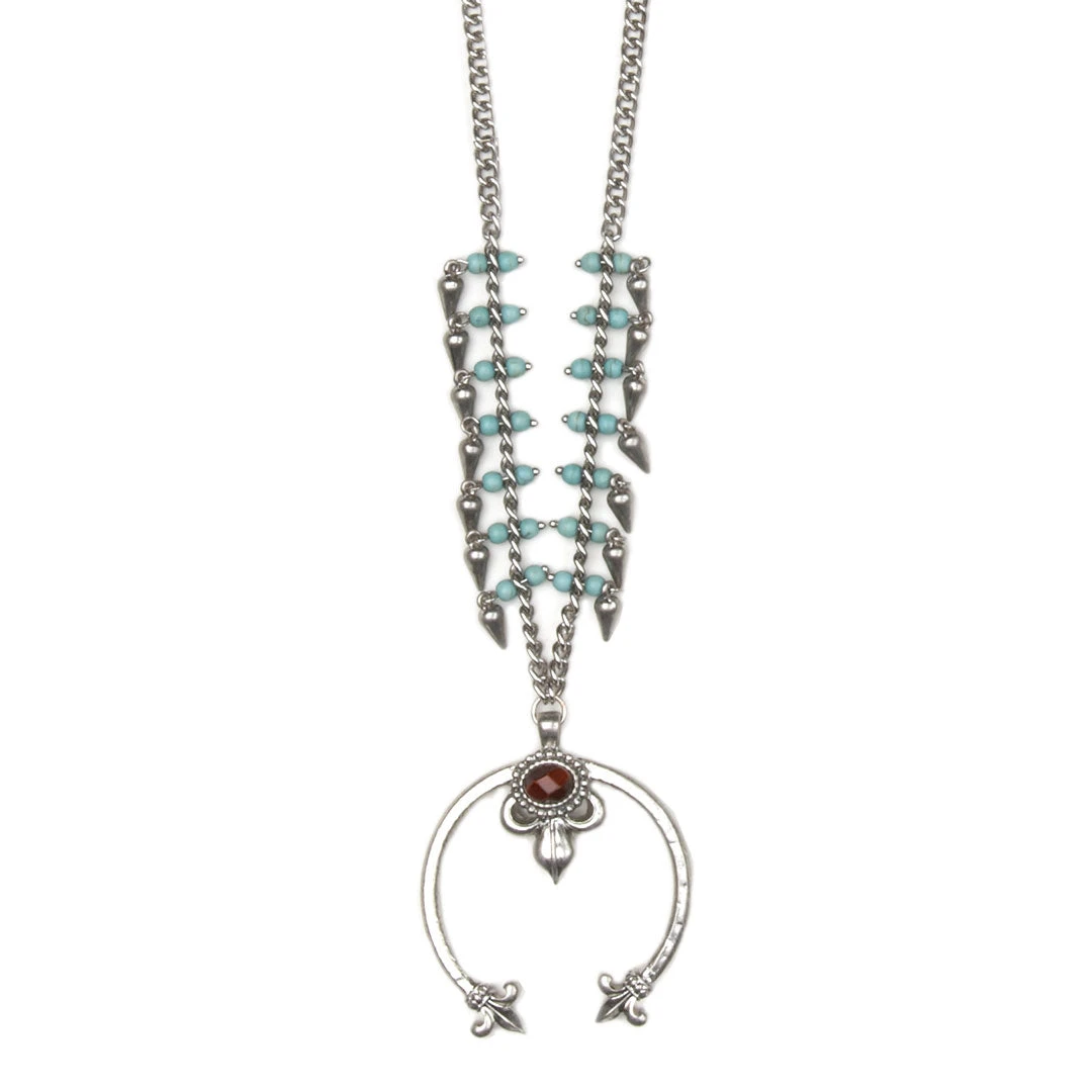 From Cowgirl Confetti by AndWest this stainless steal chain is accentuated with small turquoise beads and tear drop charms featuring a delicate Squash Blossom Naja with a faceted red tiger eye stone.