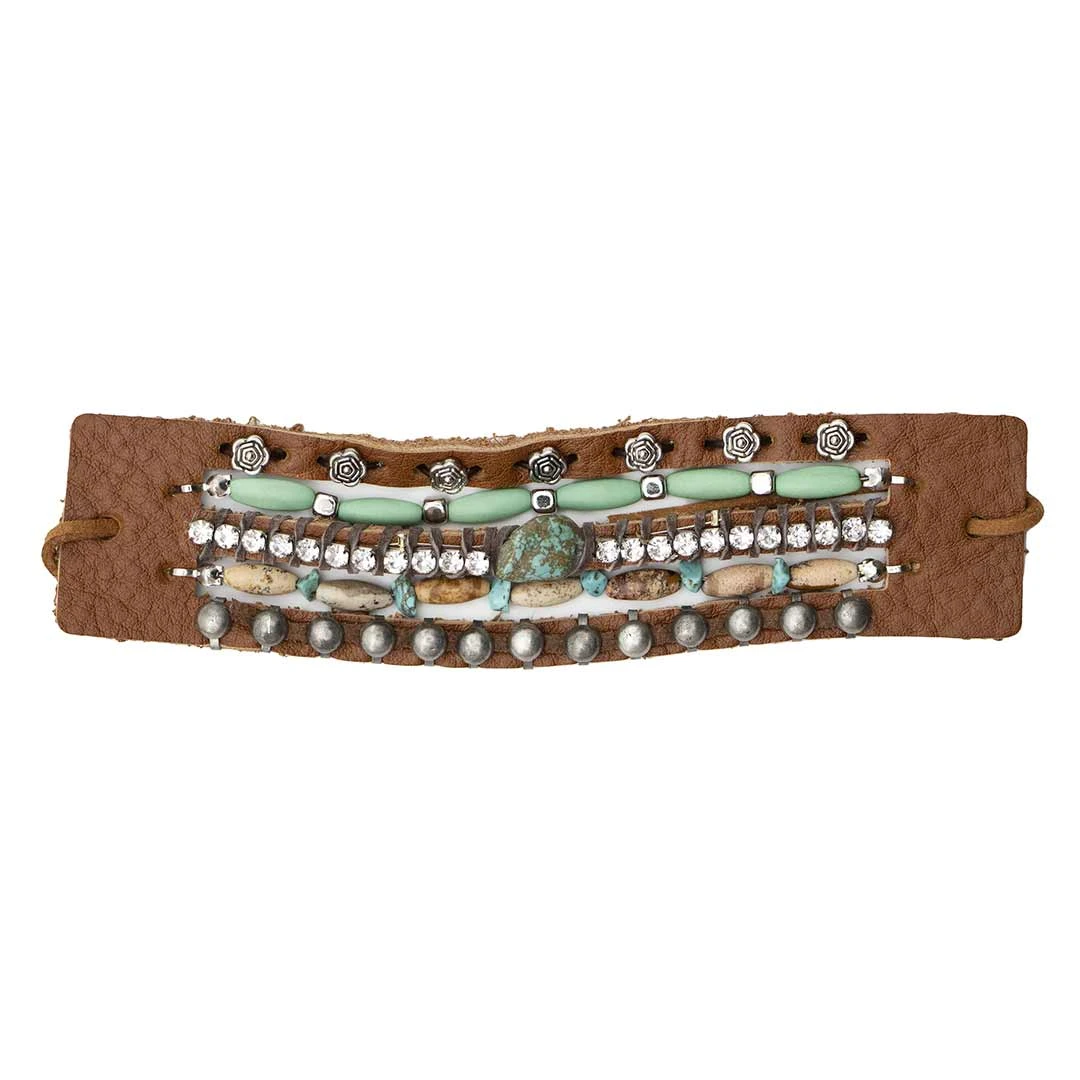 This Cowgirl Confetti tan leather multi-strap cuff has an adjustable tie closure. Turquoise nuggets, silver beads and studs, wood beads, and rhinestones make this a one of a kind stylish piece.