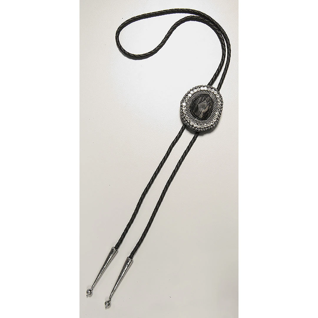 Dress up your outfit with this gorgeous bolo tie from Cowgirl Confetti featuring a large jasper stone surrounded by rhinestone and chain embellishments. The stone hangs from a black leather cord with silver drops.