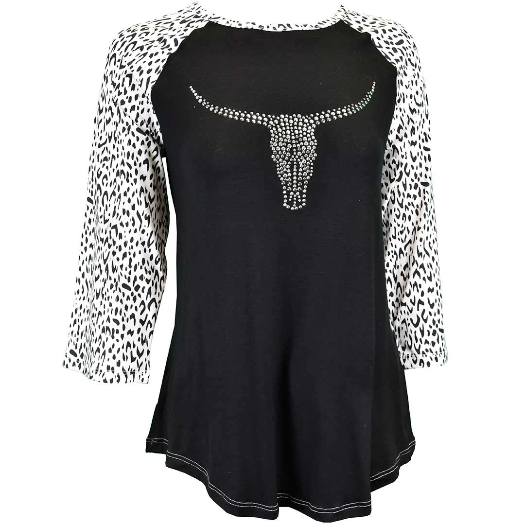 The contrast leopard print sleeves on the black body is a perfect combination for this baseball tee. The crystal steer skull design puts it over the top. The material is flowy and comfortable for all day wear.