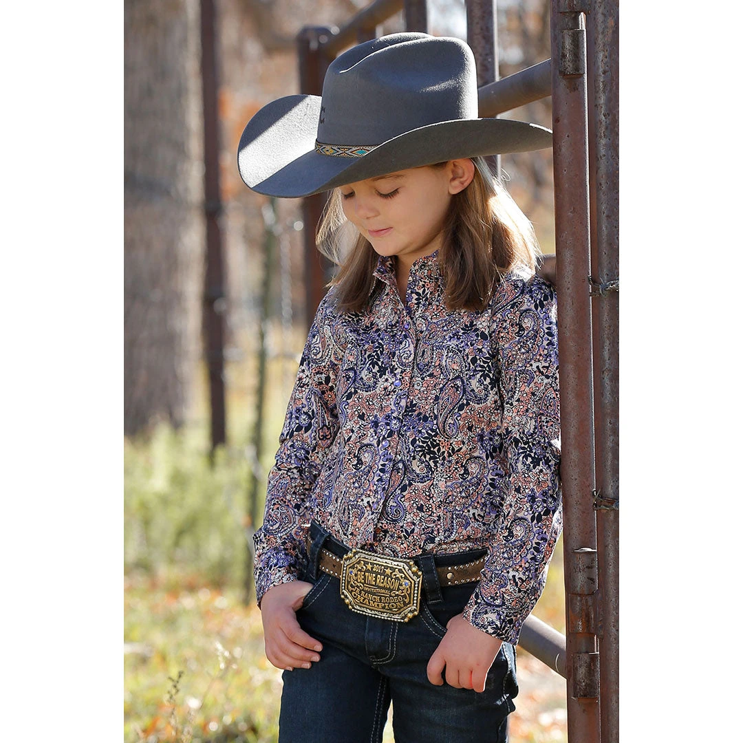 She’ll stand out in the competition arena wearing this printed cotton plain weave from Cruel Denim. Crafted in a timeless multi-colored paisley, this long-sleeved shirt is accented with lavender rhinestone snaps.