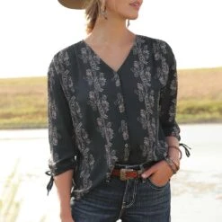 Your personal style takes on an elevated edge wearing this feminine black poly georgette blouse crafted by Cruel Denim. Printed ¾ sleeve construction features a V-neck, tie sleeve detail and metal buttons. Match with a favourite pair of blue jeans and cowgirl boots.