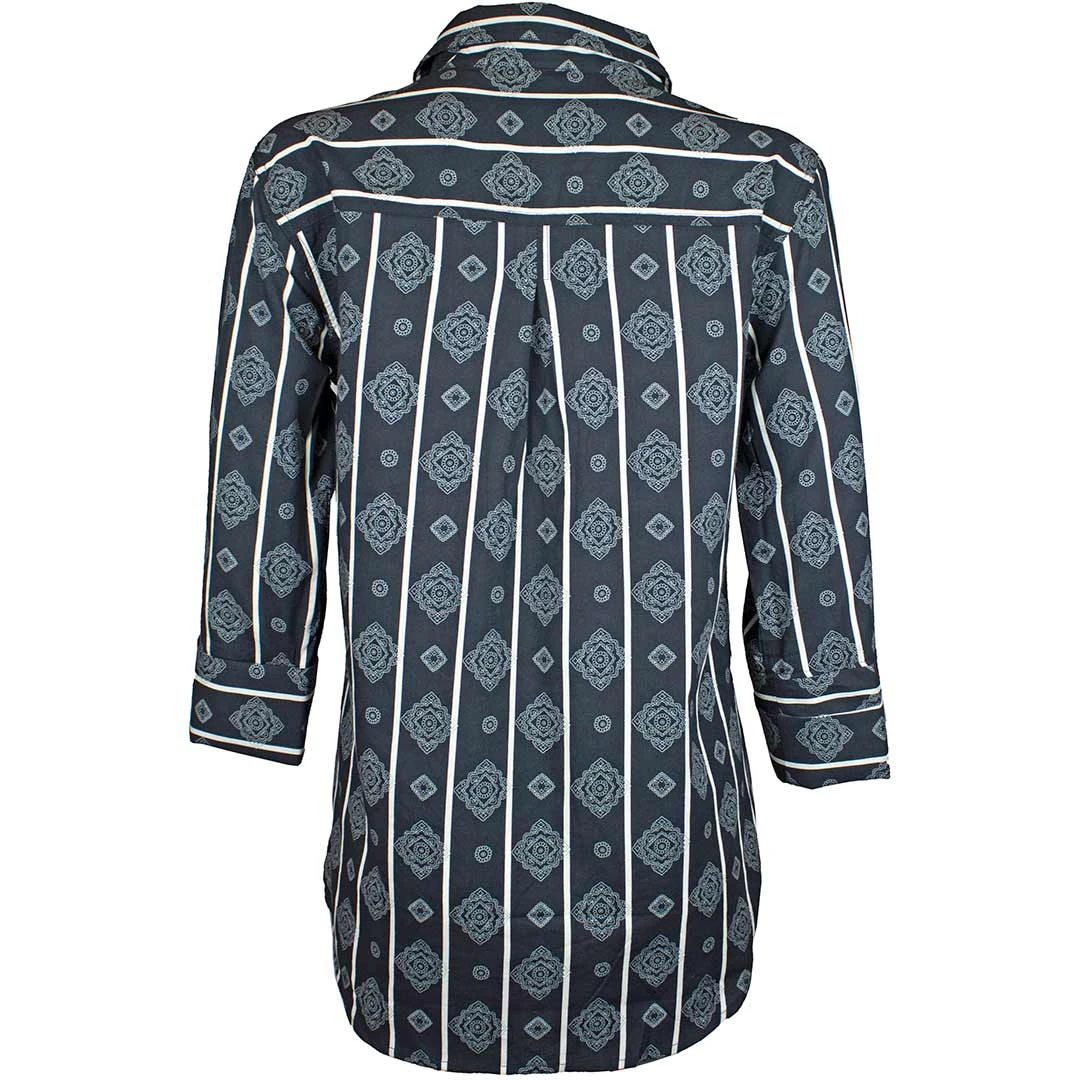 Weather can’t make up its mind? Keep fashion ready with transitional pieces like this black ¾- sleeve cotton-rayon blouse. This classy button down with a trendy twist features a geometric print, metal logo buttons and a straight hem that tucks in or wears loose over blue jeans or slacks.