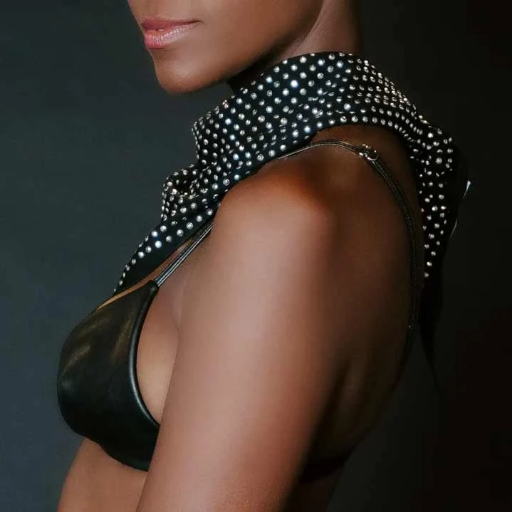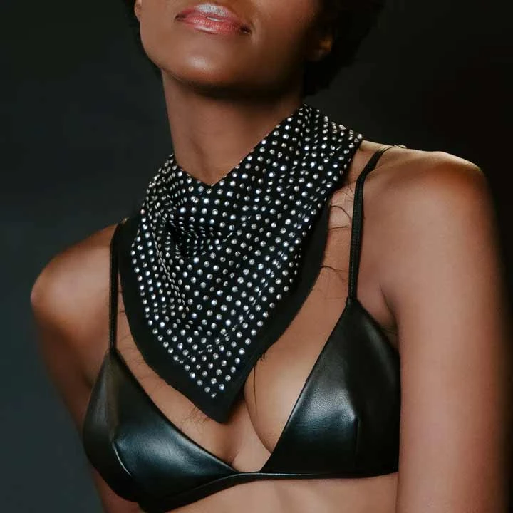 Add a touch of Daniel X Diamond to your outfit with our new rhinestoned silk neck scarf. They are for all of our bandana lovers who crave a little extra sparkle. Tie it around your neck, your hat, or even around your favourite bag handle. True to our vintage-inspired collections, its raw edge is sealed off with a finishing seam to further expand our vintage look.