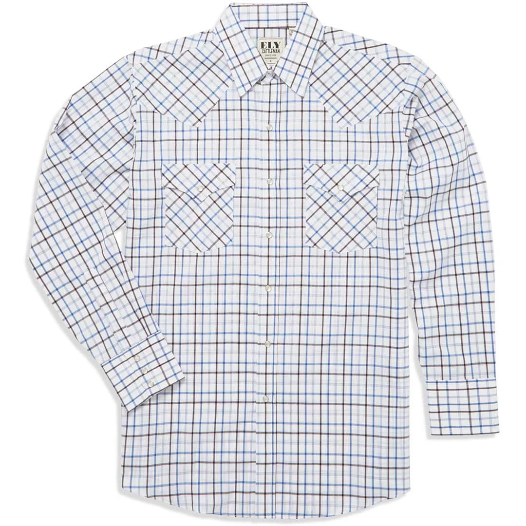 The classic! This rich looking plaid shirt from Ely Cattleman features pearlized western snaps, front and back western yokes and two front flap pockets with snaps.