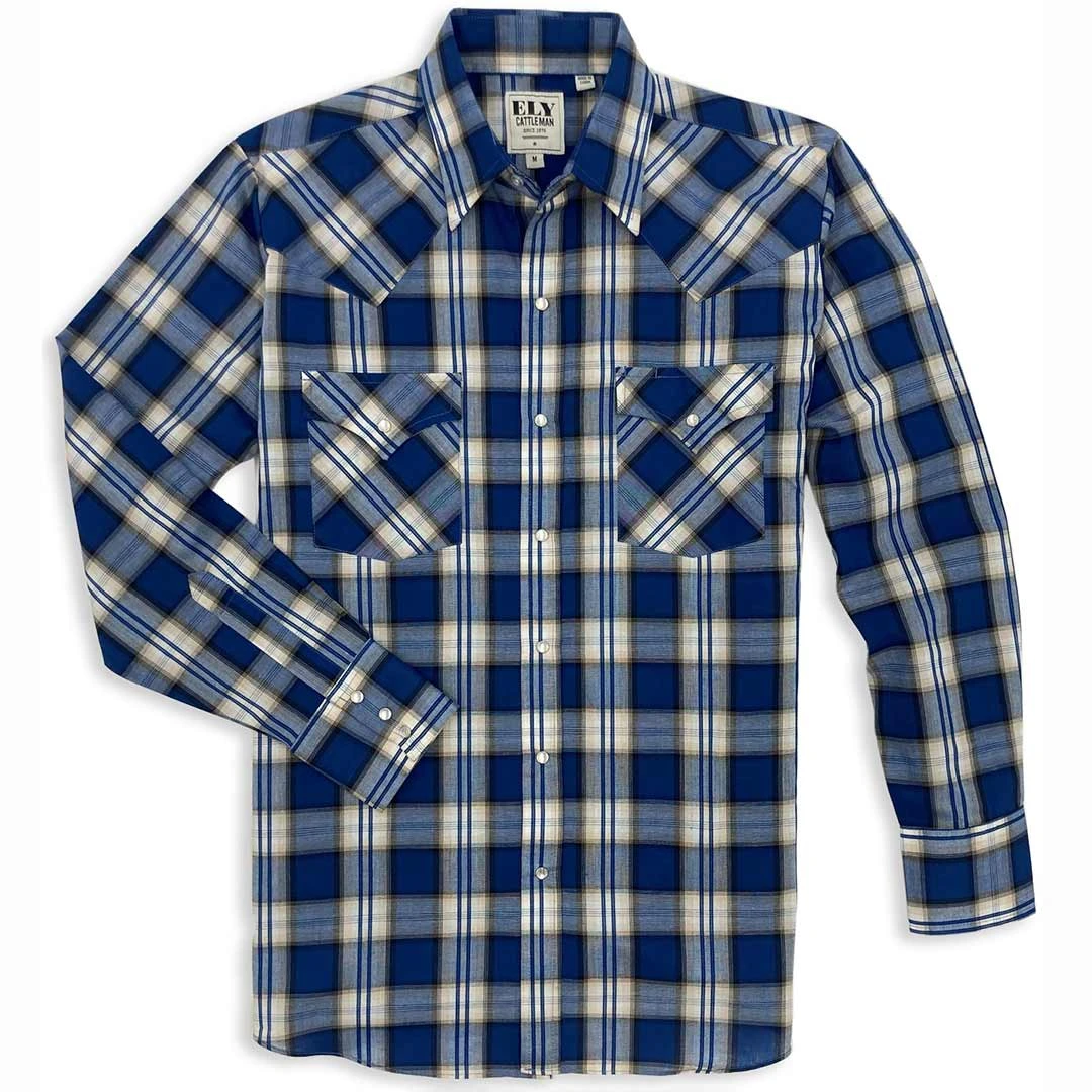 The classic! This rich looking plaid shirt from Ely Cattleman features pearlized western snaps, front and back western yokes and two front flap pockets with snaps.