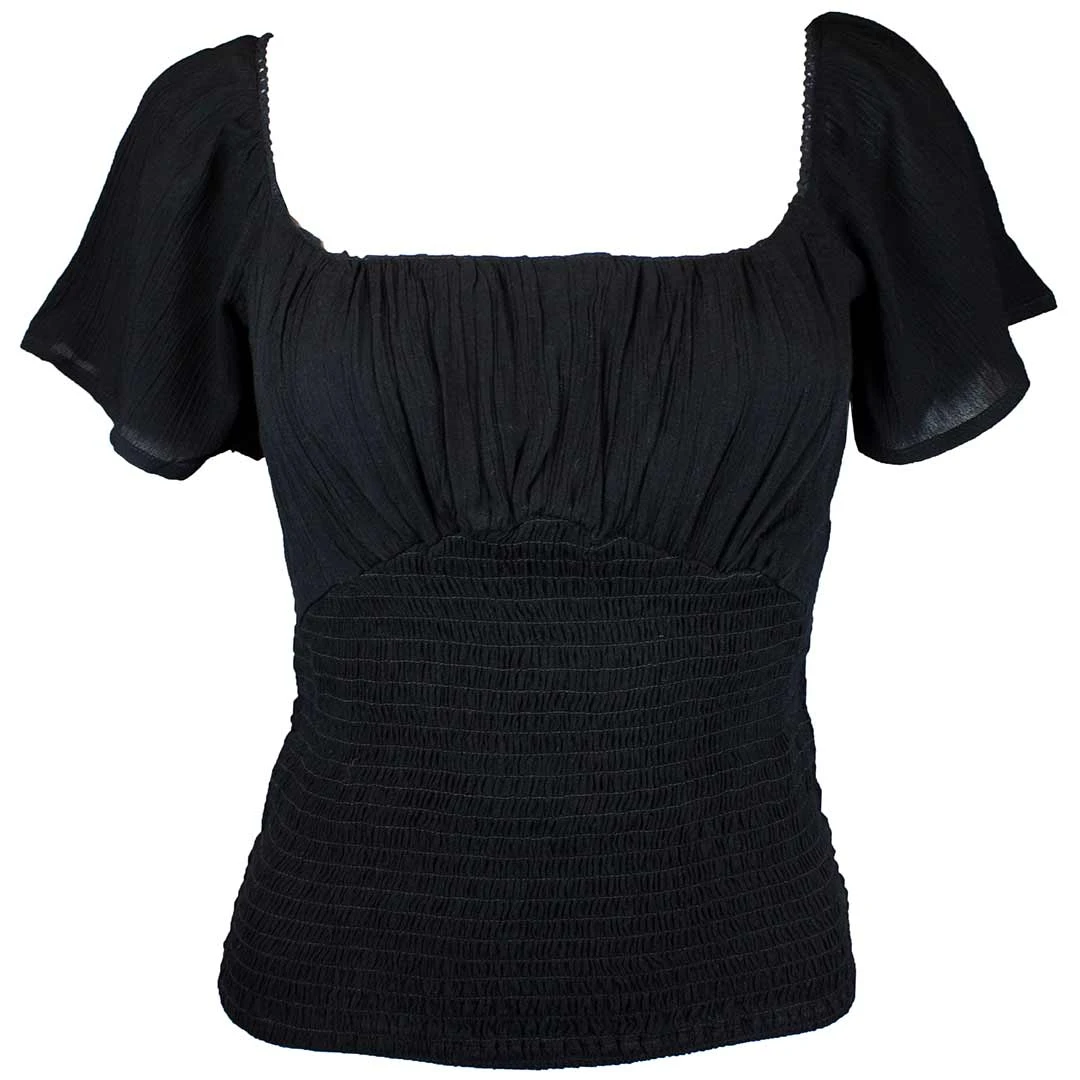 From En/Kay this cropped off the shoulder top features flutter sleeves, chest ruching, scalloped trim and a smocked bodice.