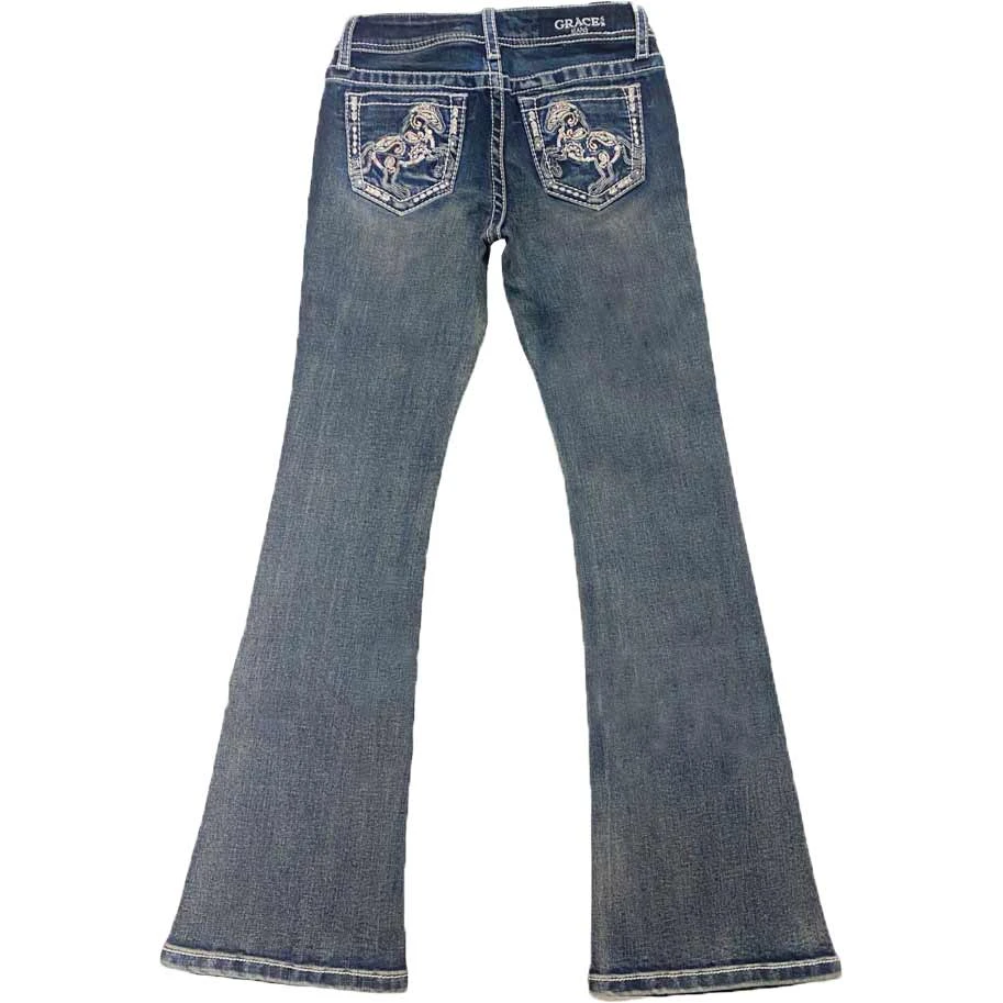 From Grace in LA these girls’ bootcut jeans are detailed with a horse embellished and embroidered design on the back pockets and added embellishment on the front pockets, natural hand-sanding, and whiskering.