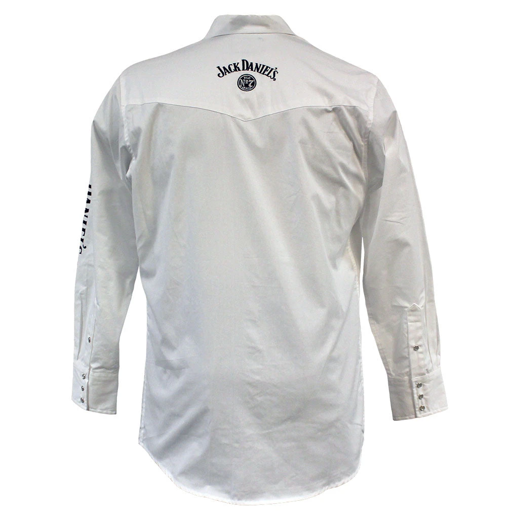 From Ely & Walker, this men’s white snap shirt features Jack Daniel’s logos on the front chest, down the left sleeve and on the back yoke.