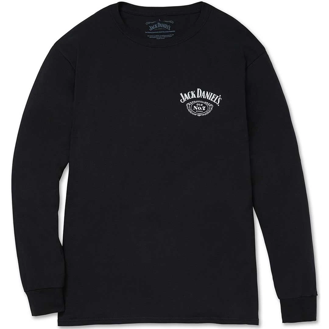 Raise a glass to the icon. This long sleeve t-shirt features iconic Jack Daniel’s Old No. 7 Tennessee Whiskey label graphics on front and back.