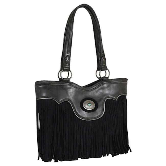 This Justin tote bag is done in a graphite finish with a silver flecked suede trim it has an antique silver Concho with a faux turquoise accent. It features one compartment, two organizer pockets, one zipper pocket, dual left/right pockets and a zipper top closure.