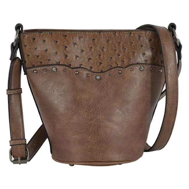 Keep all your valuables organized and secure with this Justin bucket bag. This bag features faux ostrich pattern with antique silver studs. It has one interior compartment, one zipper pocket, two organizer pockets and a zipper top closure.