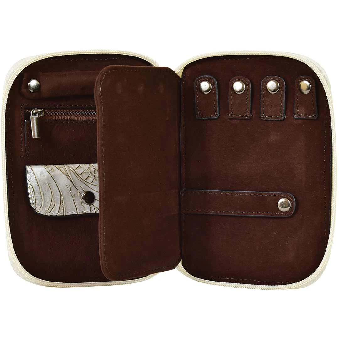 From Justin, this women’s jewelry case is silver and features beautiful floral tooling. It has one compartment, various jewelry holder, one zip pocket, one snap flap pocket and a zip around closure. The perfect choice to keep all your valuables safe.