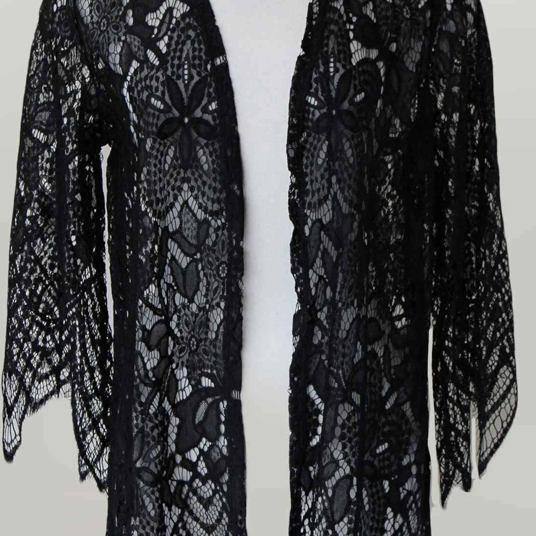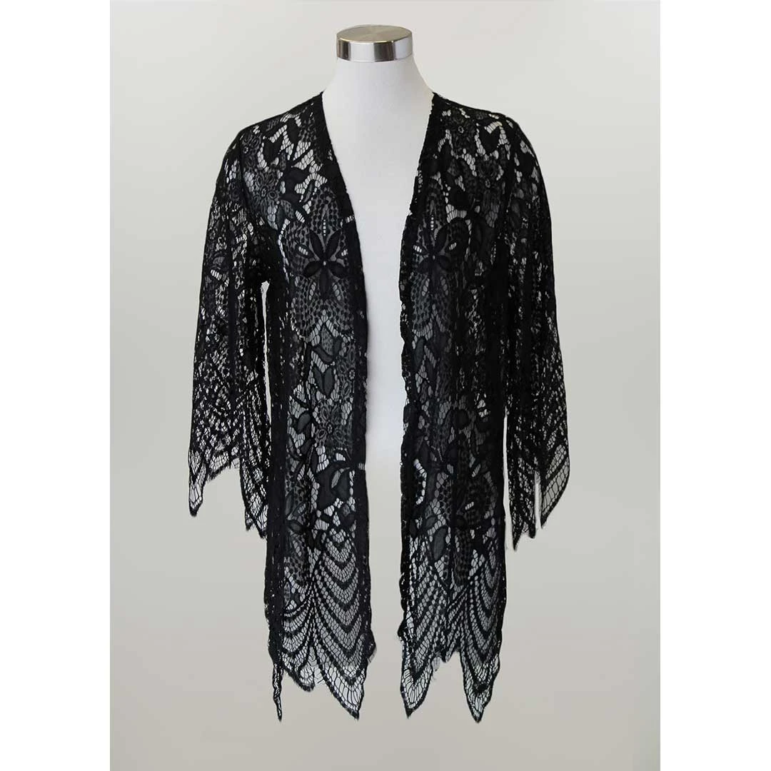A perfect extra layer for those cool summer nights! From Keren Hart, this women’s lace cardigan features a scallop hem, 3/4 length sleeves and an open front.