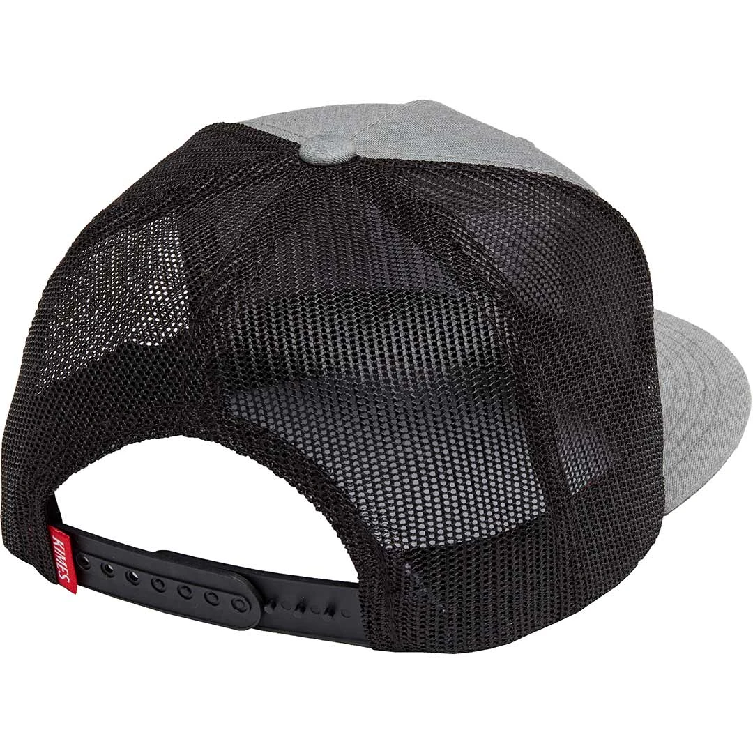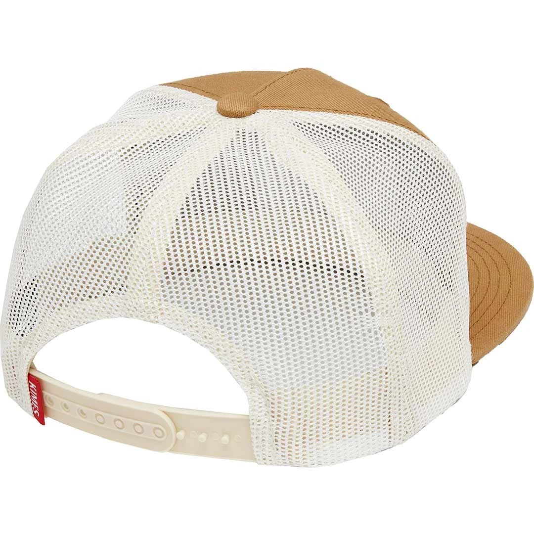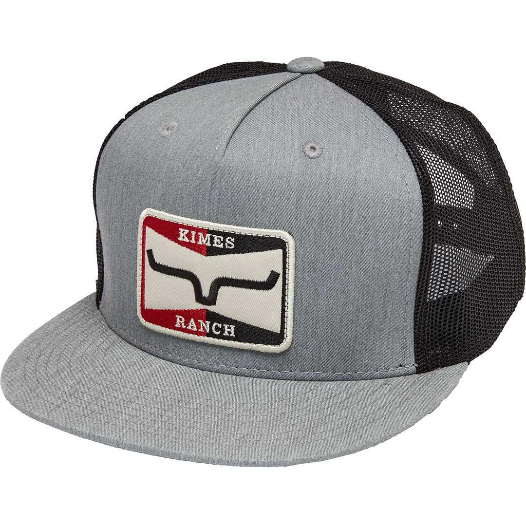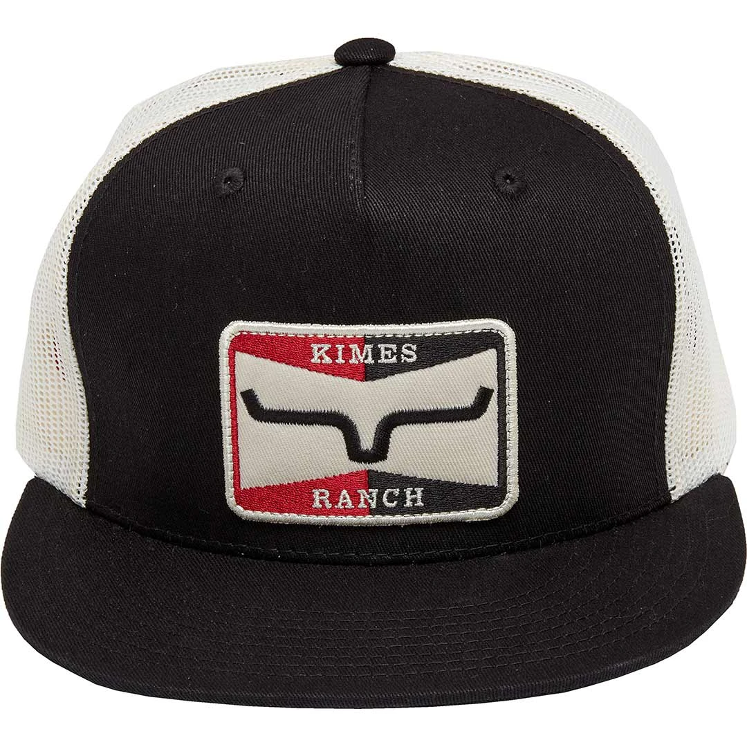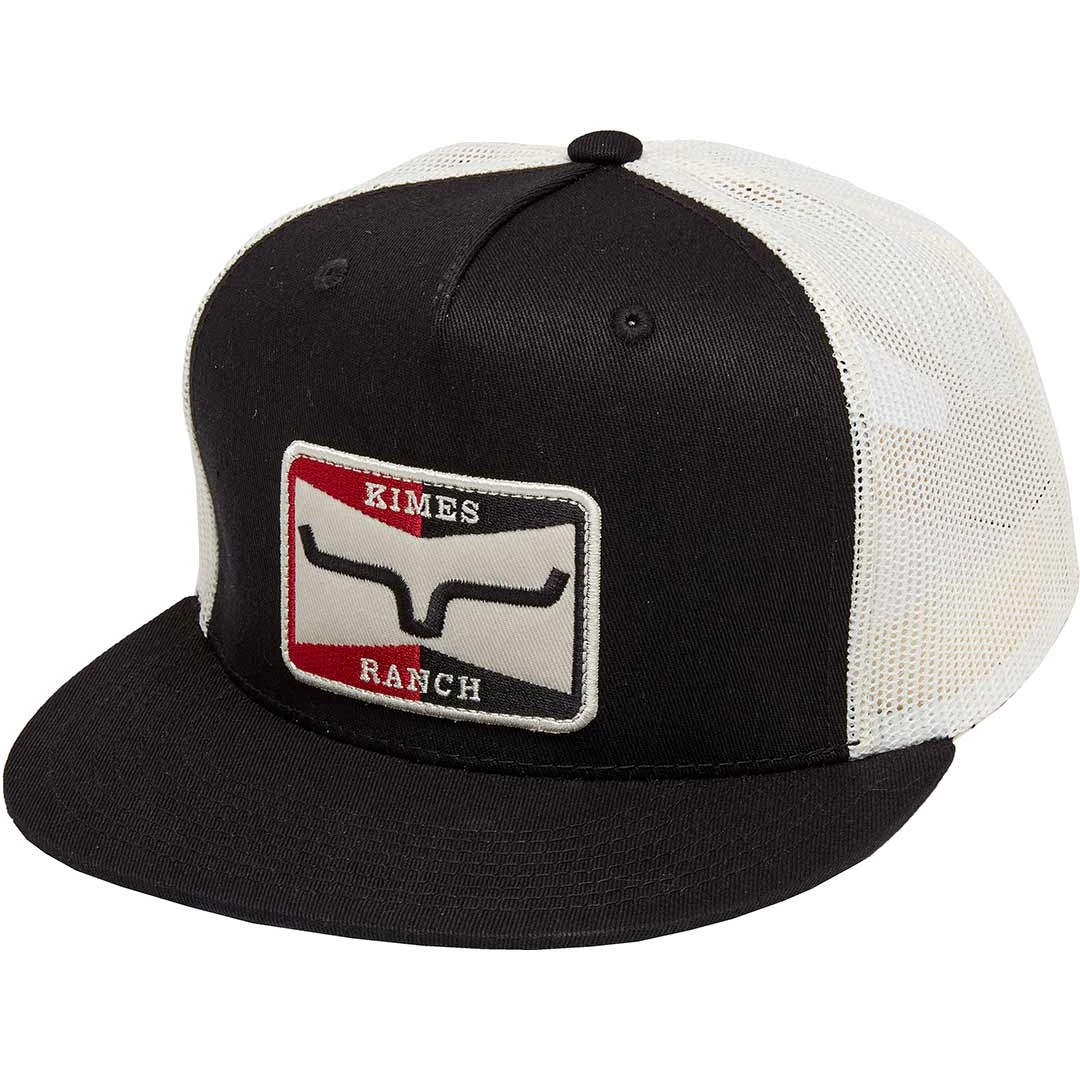 The Sparky trucker cap from Kimes Ranch features 5 panel construction, a mesh back, snap back closure, embroidered red, black and white horns twill patch on the front and a flat bill.
