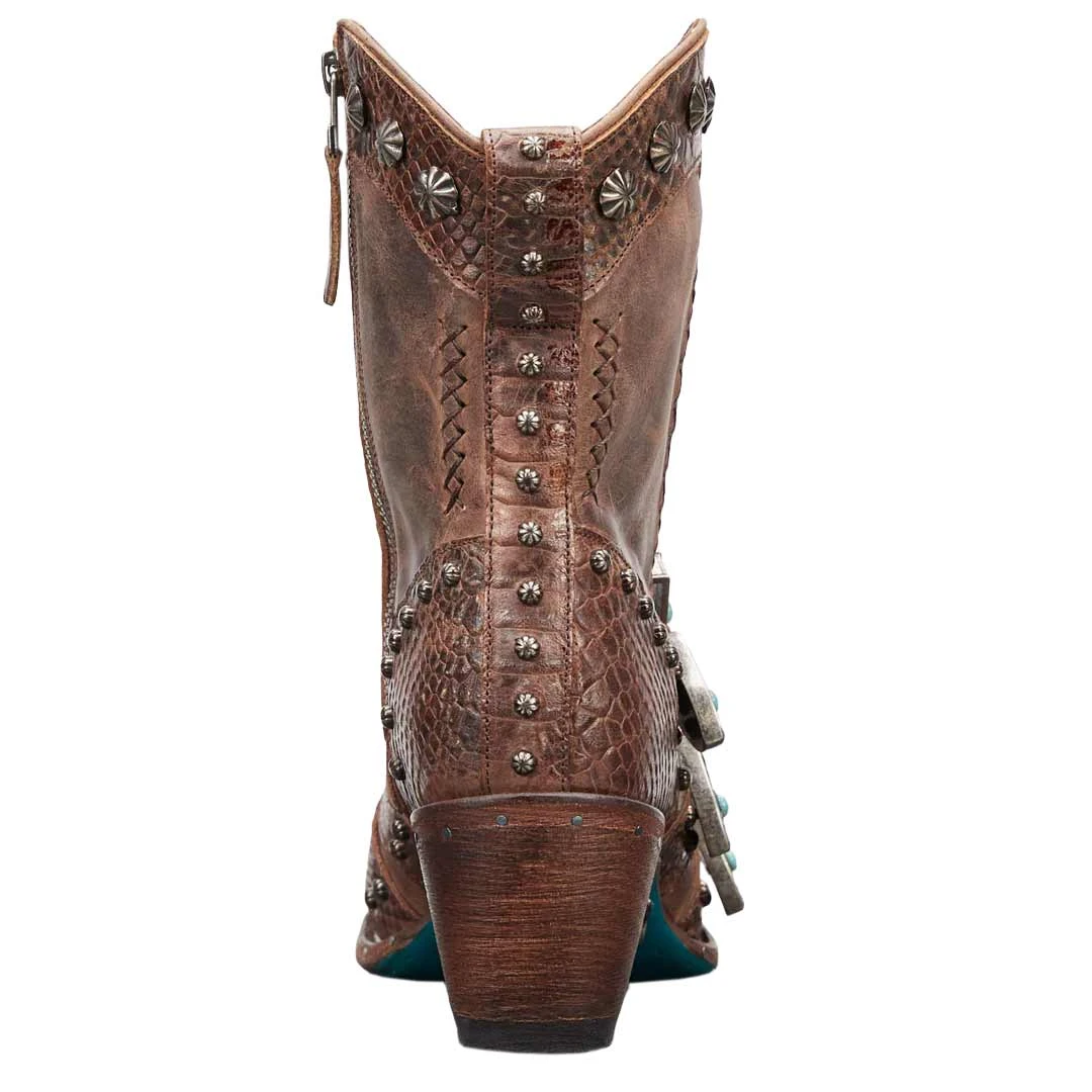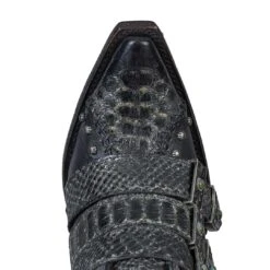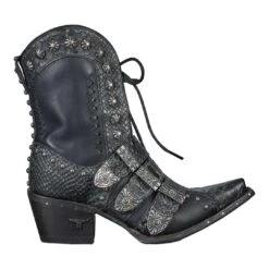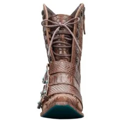 Step out boldly in variegated exotic leather, old pawn inspired hardware, and a functional corset on this ankle boot baddie. An elevated heel to accentuate your best features and bring confidence to your step.
