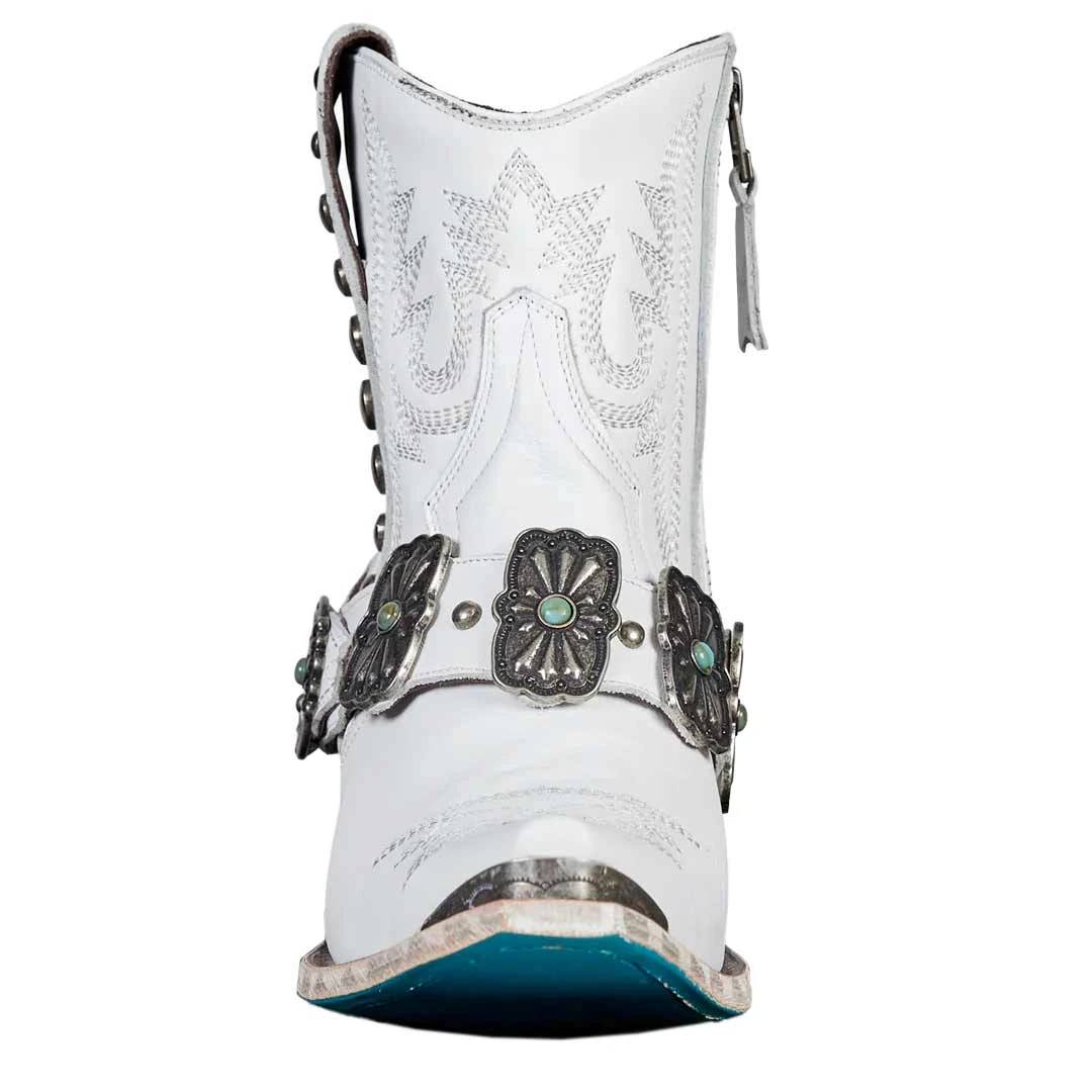 The pinnacle of western fashion ankle boots in matte white. Graduating nail-head studs that outline thick flame-stitch embroidery. A full side zip fastens the harness with old pawn inspired conchos that set the stage with a turquoise center enveloped in hand stamping. A stylized toe guard caps off the piece and each step feels a little more powerful than the last.