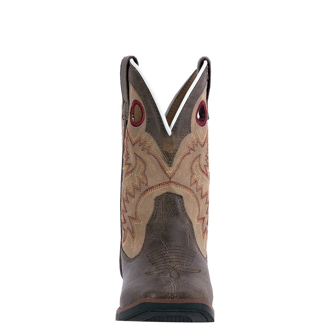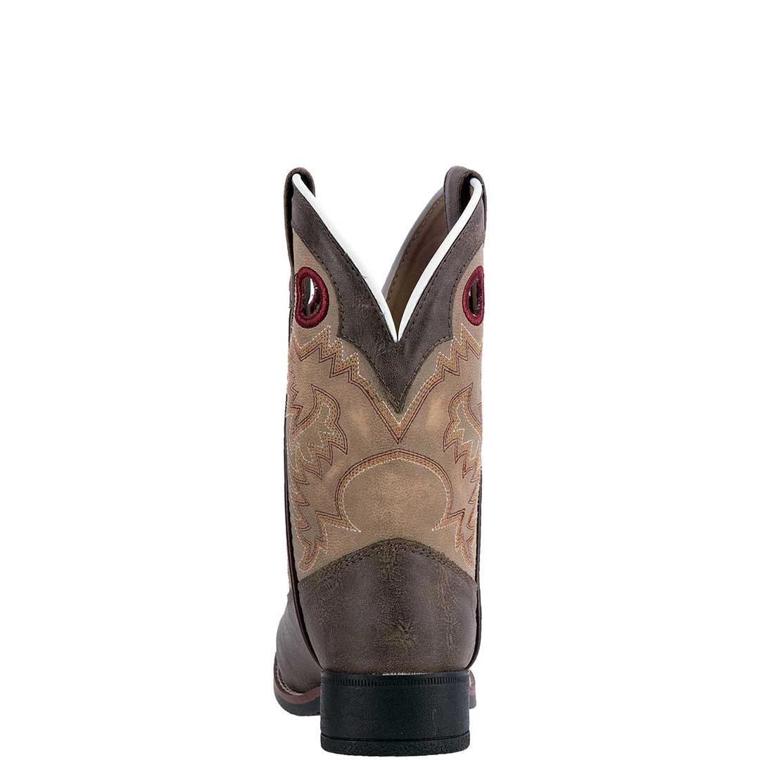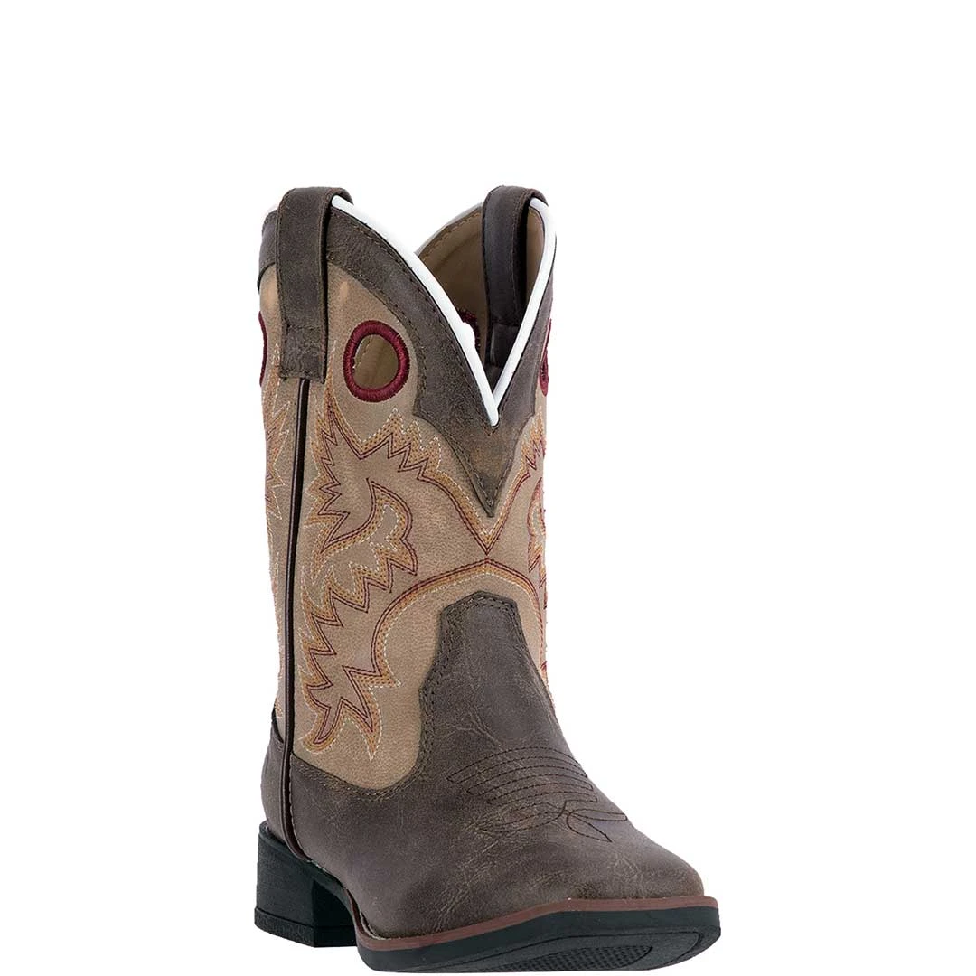 From Laredo, these kids’ western boots feature a dark brown foot and collar and a light brown upper with orange and burgundy stitching. Your little one will love the two-tone look.