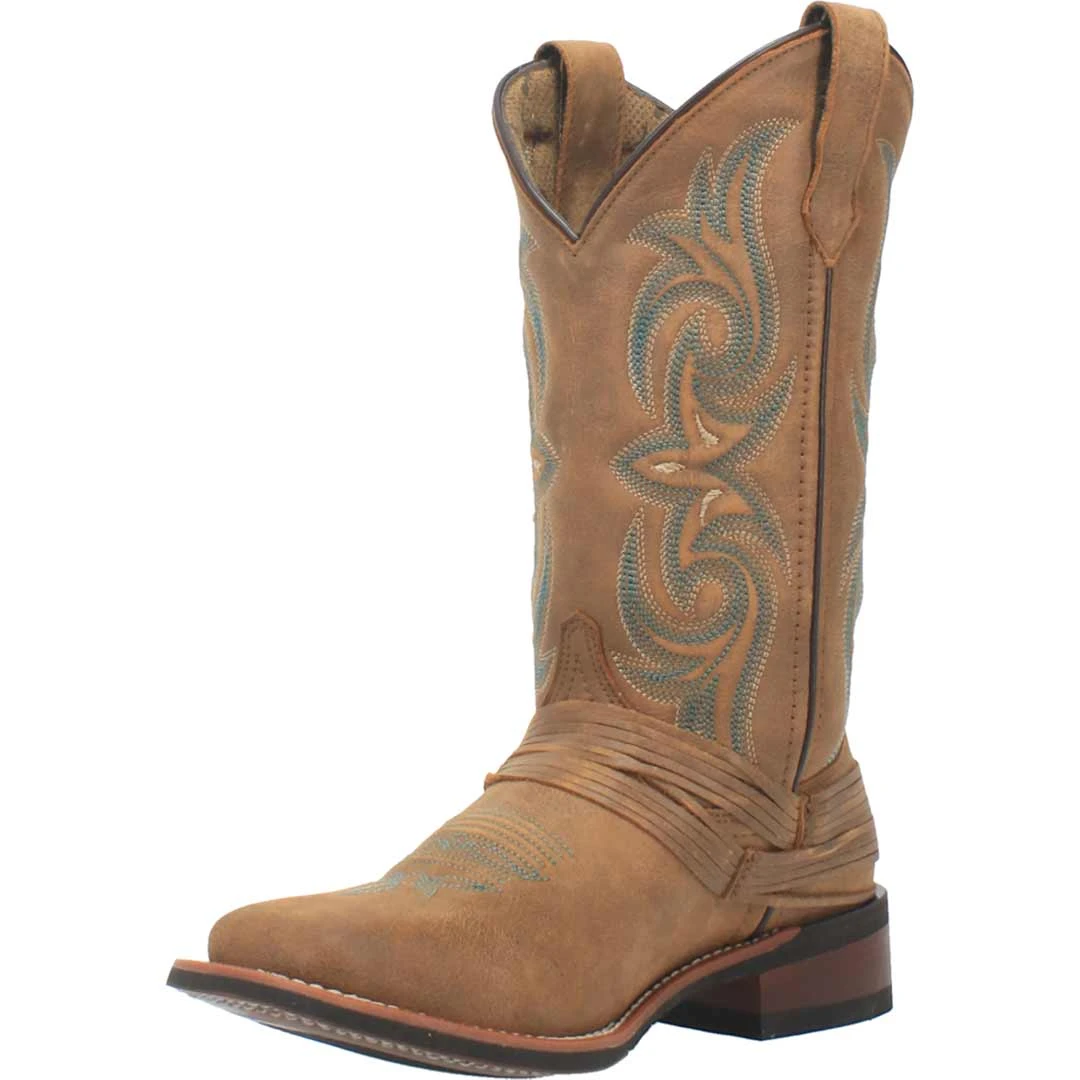 Calling all cowgirls! You are going to LOVE the Laredo Cowboy Approved Sadie boot. The tan leather boot is stitched in contrasting turquoise thread. For an added touch of flair there is a wrapped and knotted strap with fringe. Features broad square toe, stockman heel and long wearing rubber outsole.