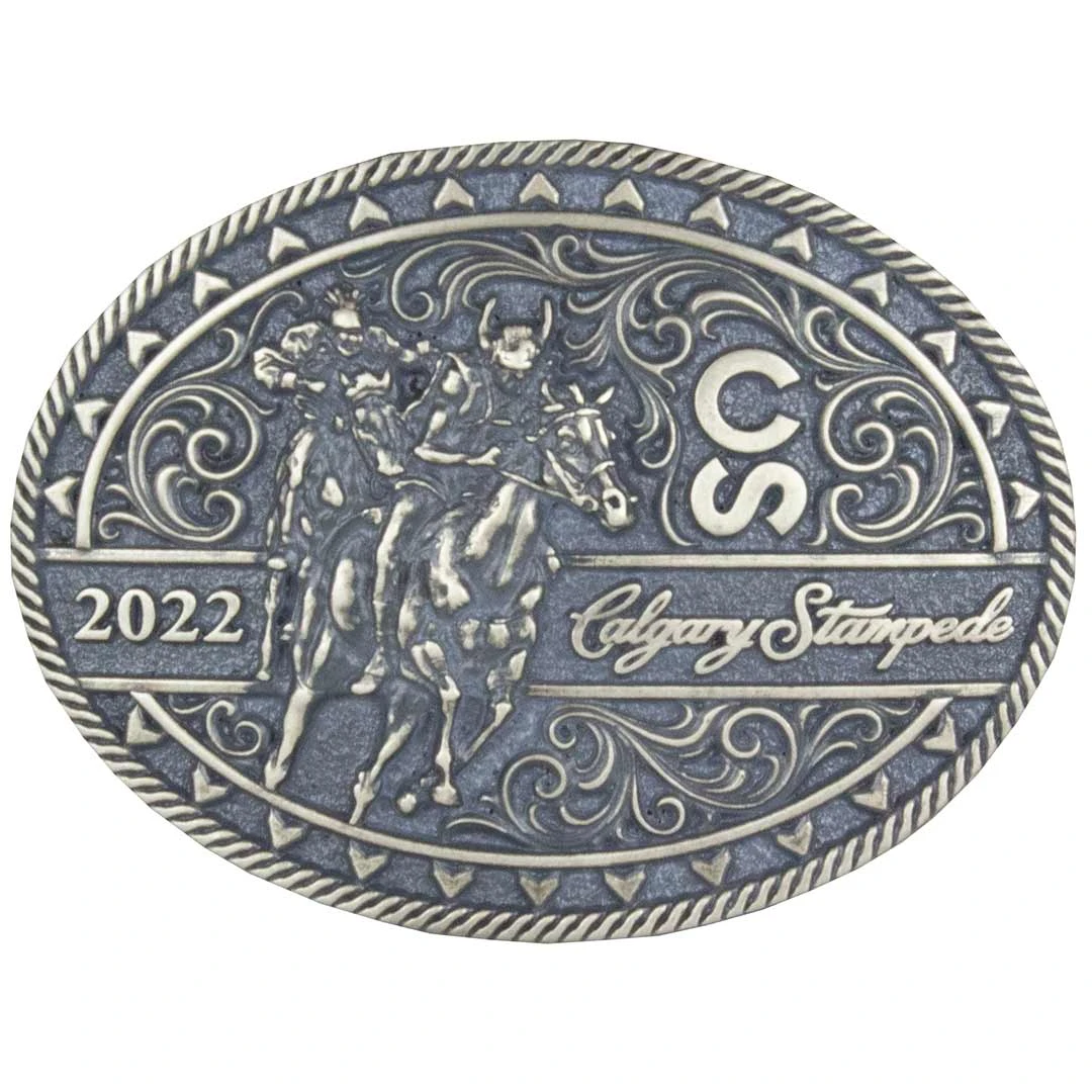 Official 2022 Calgary Stampede poster buckle crafted by Montana Silversmiths in pewter finish. This rectangular buckle features a hand sculpted Relay Racer. The Calgary Stampede logo and brand is boldly showcased on the buckle in celebration of the “Greatest Outdoor Show on Earth”.