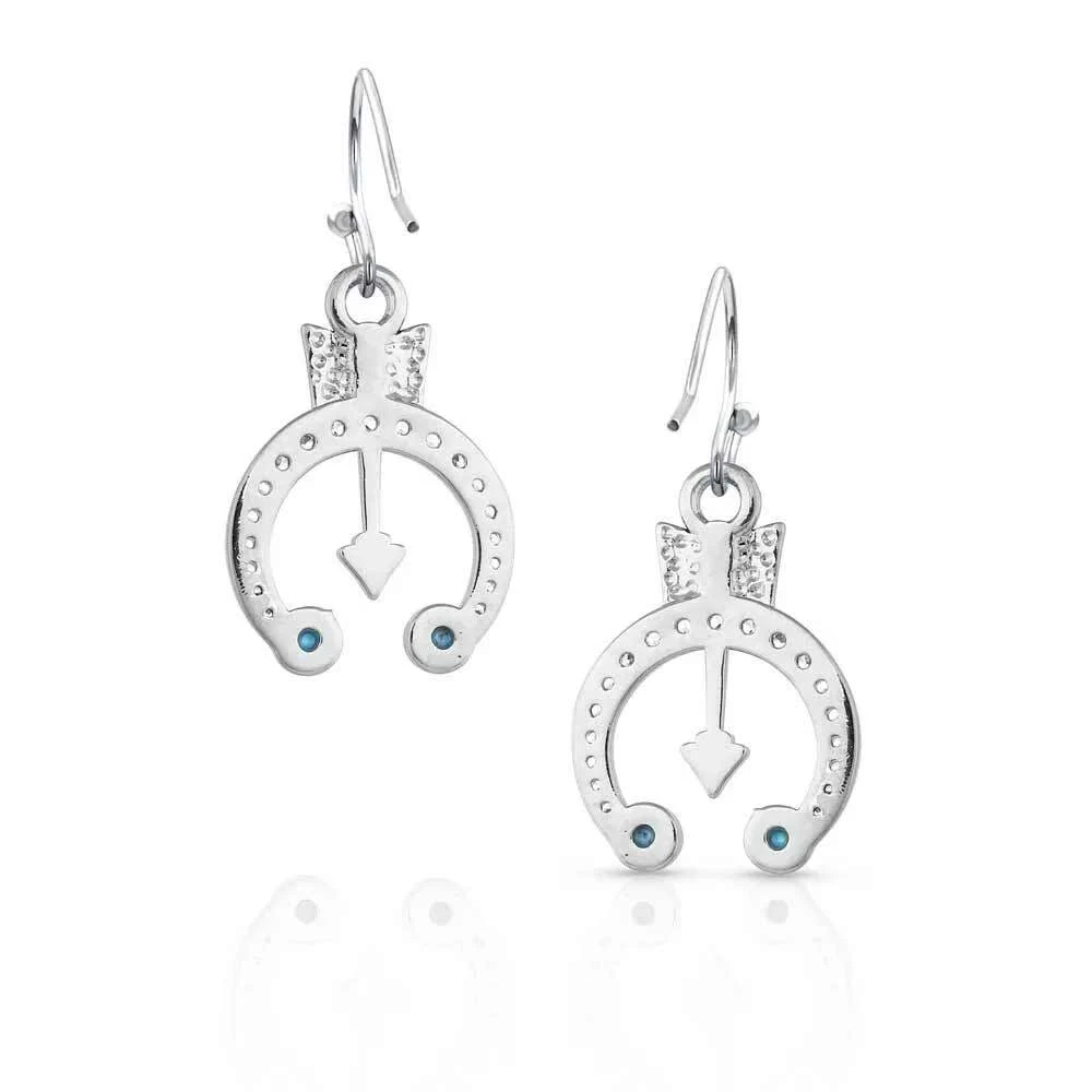 You are the creator of your destiny and luck. But we figured that we could help a little bit. The Creating Your Luck Blossom Earrings are the perfect good luck charm. Featuring a clear crystal-studded silver horseshoe with compressed turquoise stones with copper attached to each end of the horseshoe. At the top of the horseshoe pointing downward is a delicate arrow that attaches to the hypoallergenic French wire to complete the incredible earrings. Stone colour will vary.