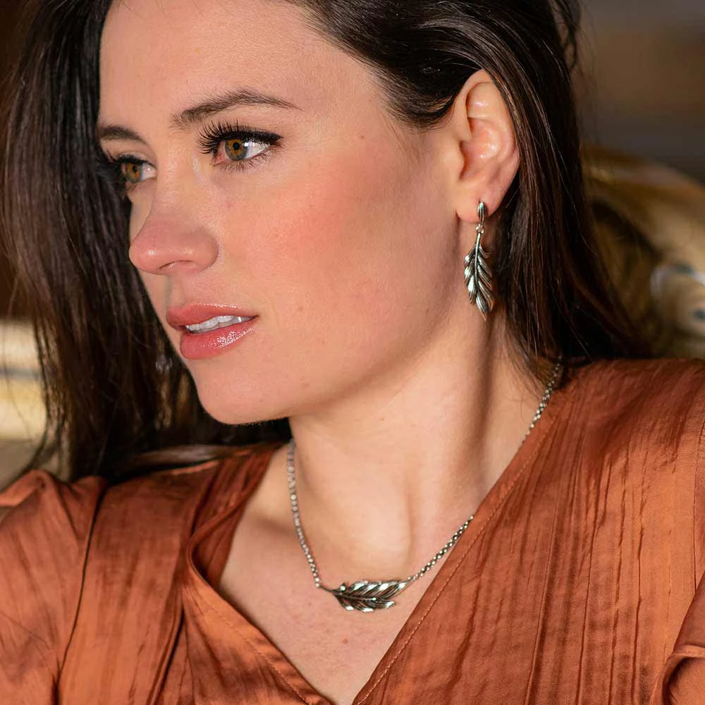 Montana Silversmiths Frayed Singleton Feather Jewelry Set includes earrings and a necklace that are a carved solo feather that beautifully dangles delicately from a contoured stud under your earlobe and horizontally on your neck. They are antique silver-toned with hand painted black between the feather strands to create dimension and depth. Necklace is similar design and hangs from a 19″ split chain.