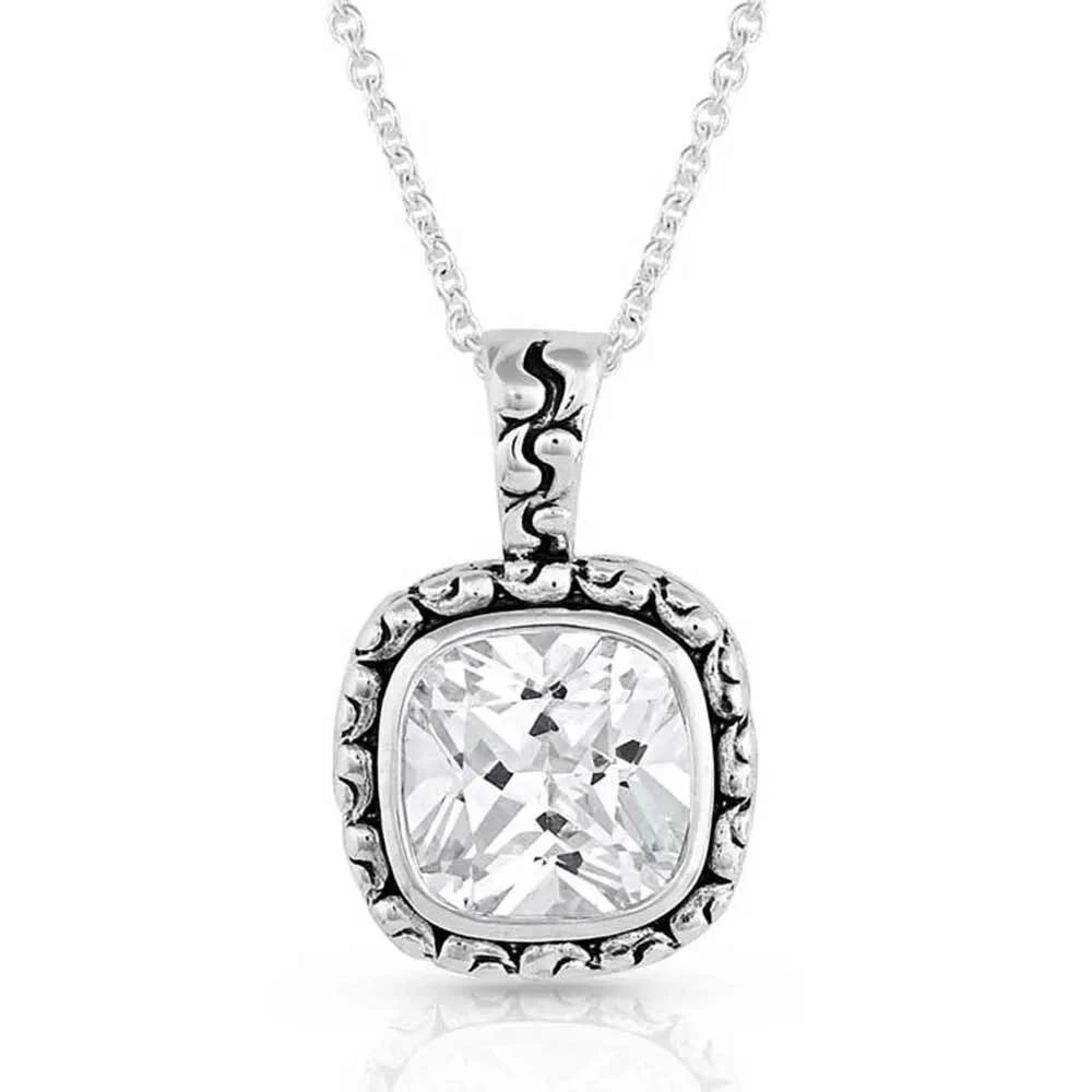 We couldn’t be happier about the Western Delight Crystal Necklace. The gorgeous necklace showcases a square-shaped clear cubic zirconia crystal with a smooth silver setting that secures the stone in the pendant. The crystal is surrounded by an intricate etched design that continues up to the bail to loop around and secure to the 19-inch chain.