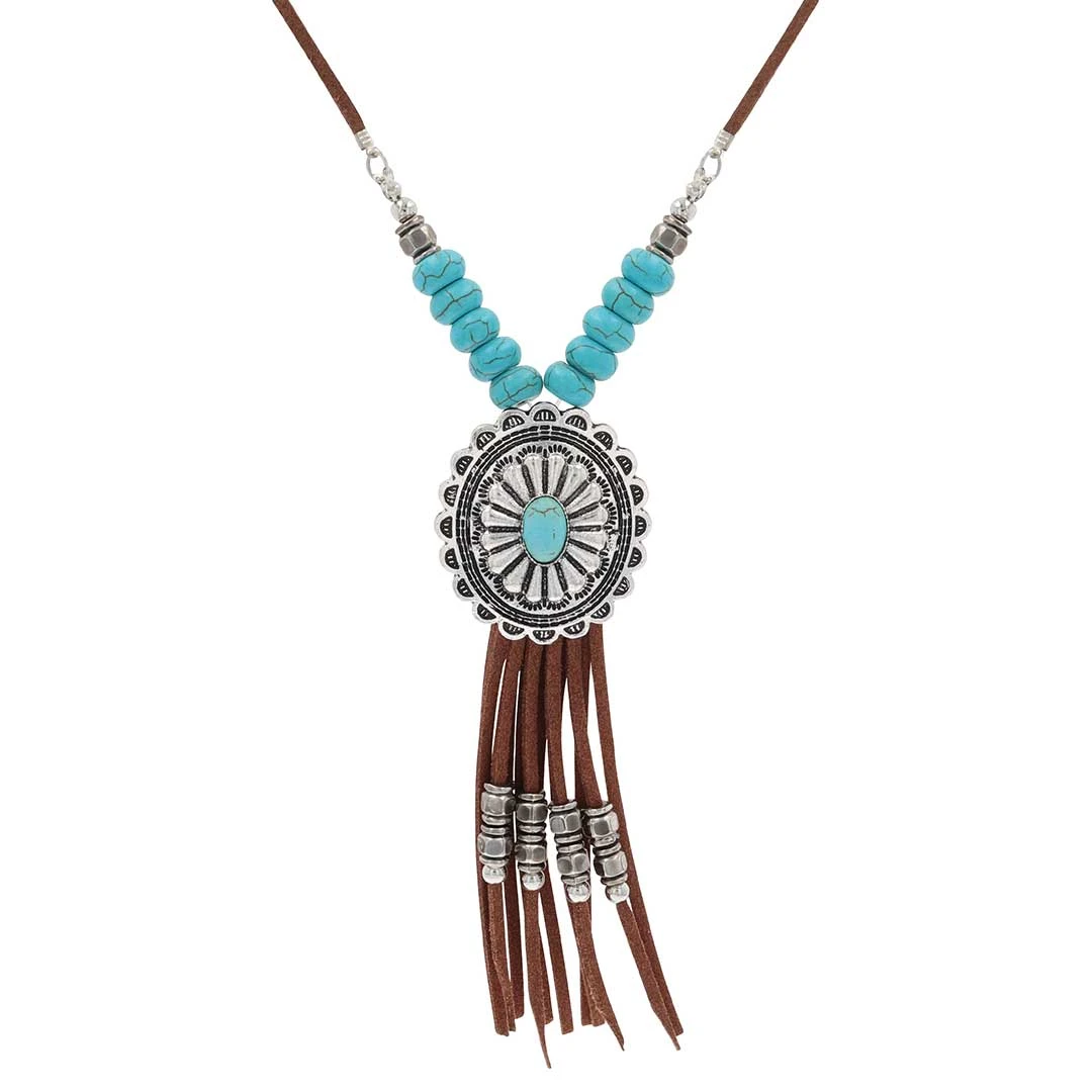 A bar above the rest, this fringe Attitude necklace from Montana Silversmiths has a thin leather cord that runs down to a set of silver toned beads on either side, followed by a set of 5 slightly squashed round turquoise beads. The strands connect to hold a scalloped edge antiqued silver tone Concho with a floral design surrounding a center oval turquoise colored stone. Brown leather fringe flows down from the Concho, some leather strands hold an assortment of beads that match the beads above. Necklace measures 31 inches in length.