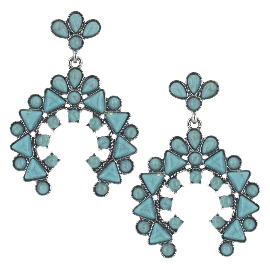 A new take on the classic squash blossom look from Montana Silversmiths. Lucious, blue green stones create a crowned squash blossom design that is formed from layers of different shaped beads that looks like a wash of glacial blue. Earrings have hypoallergenic stainless steel post backs.