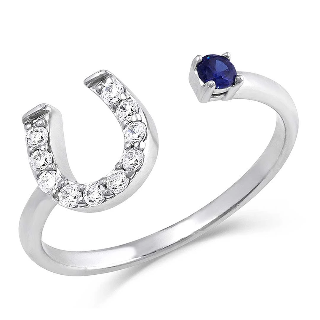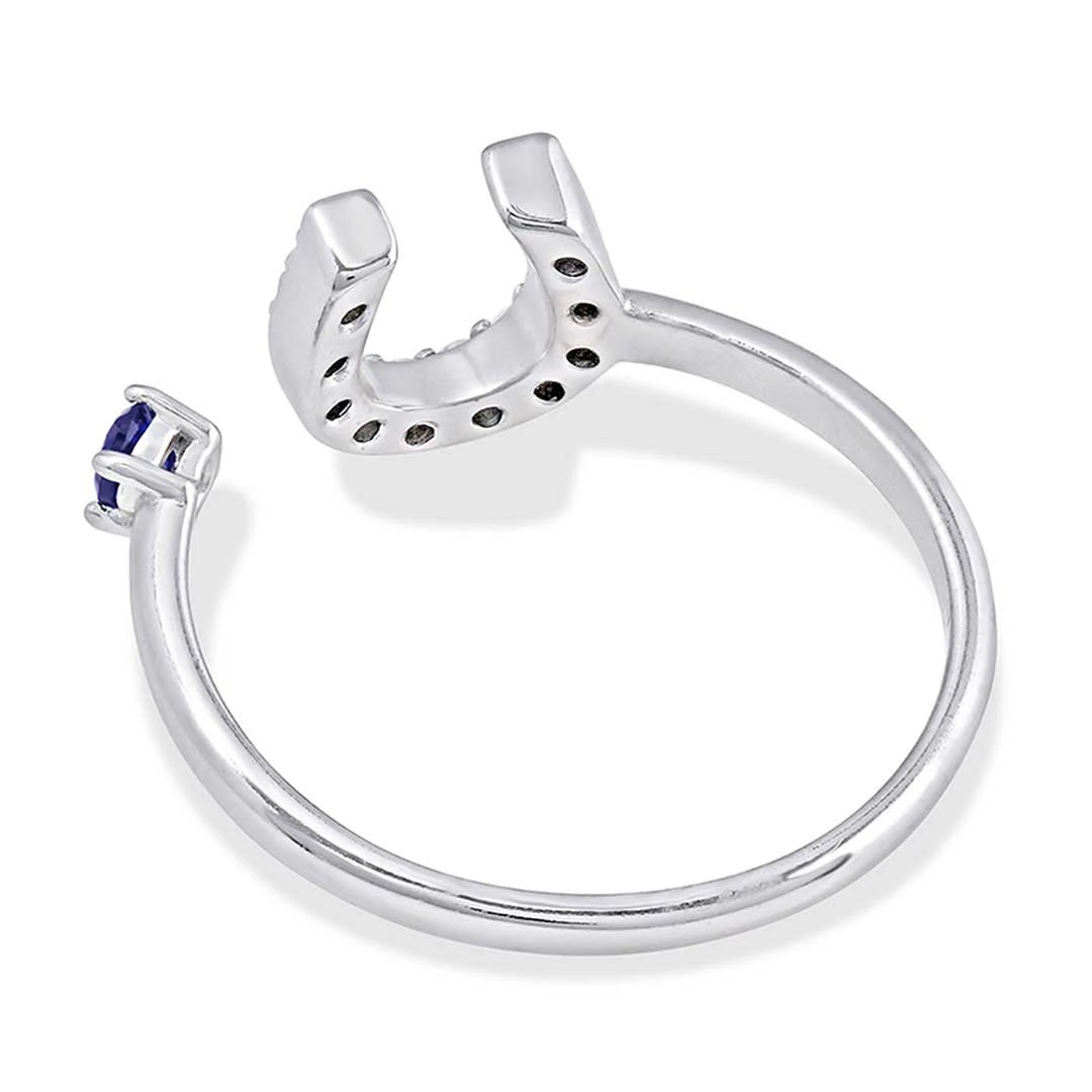 This ring is for all the cowgirls looking for a bit of luck! From Montana Silversmith, it is a silver-toned ring that is smooth in finish. It is an open ring – meaning it never fully closes. One end of the open ring has a crystal studded horseshoe, while the other end of the open ring has a navy blue crystal held in place by four-prongs.
