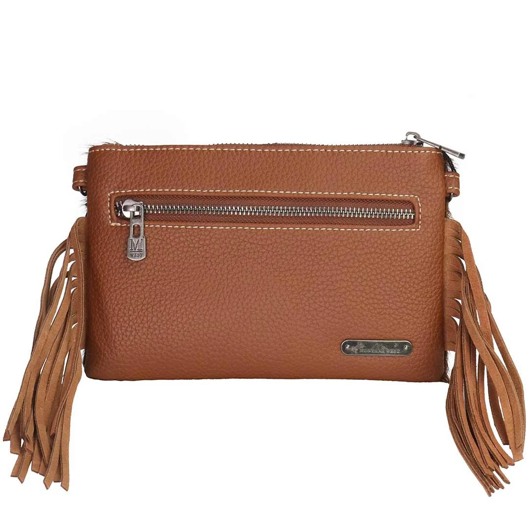 Made of PU leather, this crossbody bag from Montana West features a genuine hair on hide front panel, fringe sides, top zipper closure, a zippered pocket inside compartment, 4 card slots, zippered pocket on the back and a detachable adjustable strap and wristlet.