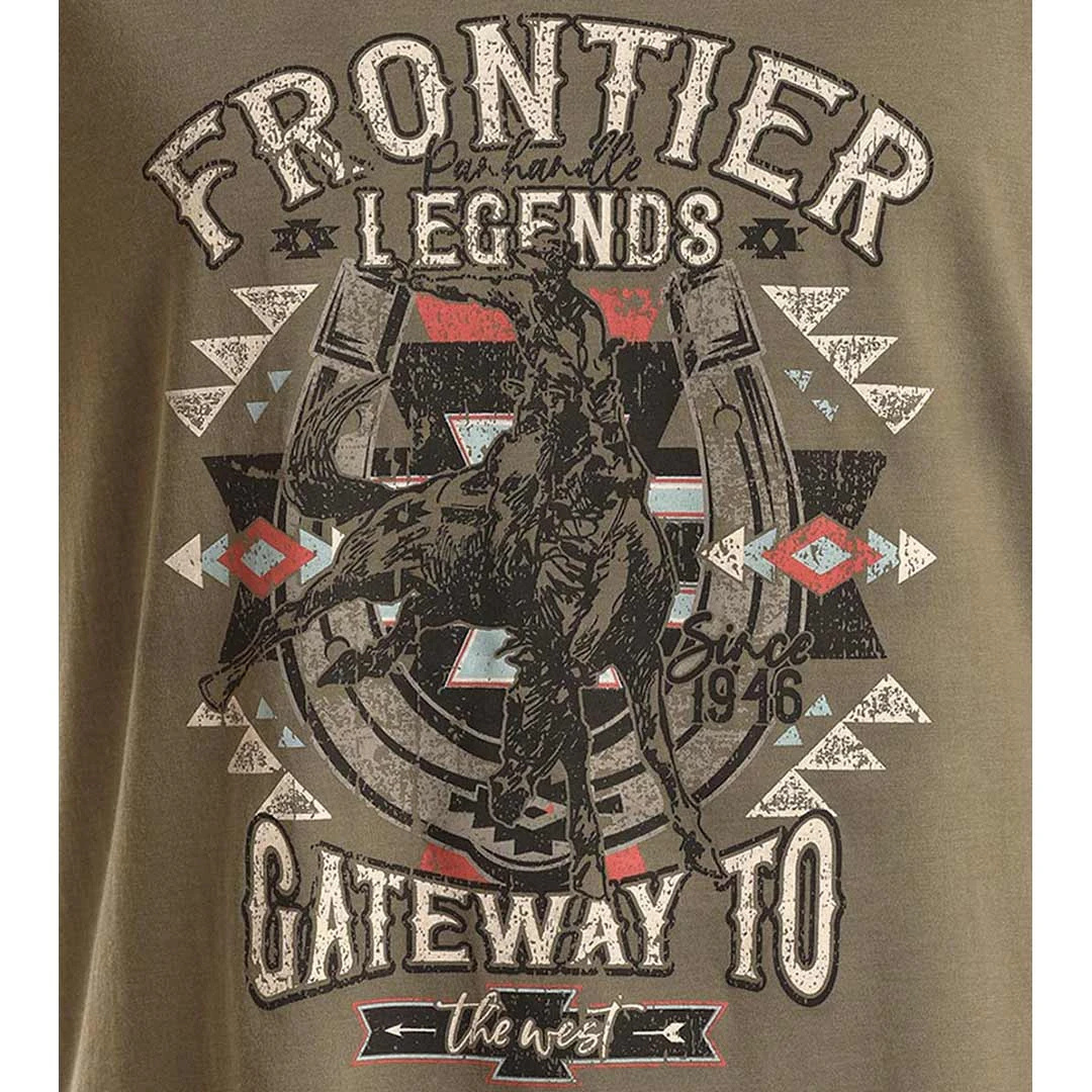 From Panhandle this women’s t-shirt features a crisscross split V-neck, relaxed fit, tunic length and a Frontier Legends screenprint graphic.