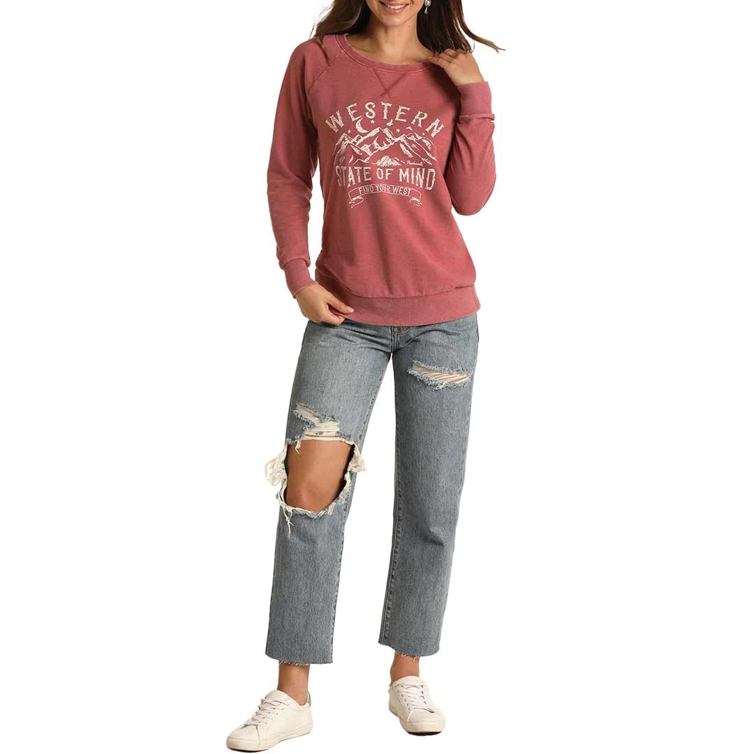 From Panhandle this sweatshirt features a wide neck, ribbed knit cuffs and hem and a “Western State of Mind” screen-print graphic.
